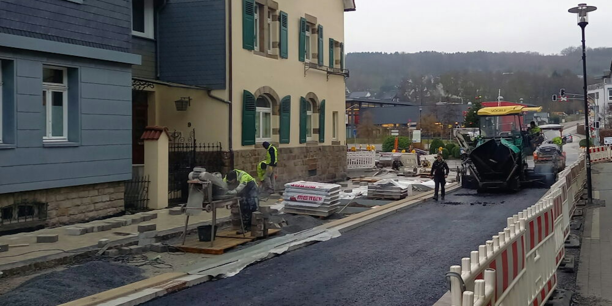 Mitte Dezember ist der Bereich im ersten Abschnitt asphaltiert worden. Tragschicht und Binderschicht sind eingebaut, dadurch bleibt die neue Straße geschützt vor Frostschäden, teilt die Stadt mit. Zum Baufortschritt sagt die Stadt darüber hinaus, dass an sämtlichen Häusern neue Anschlüsse für die Wasserleitung gelegt wurden. Der Kreisverkehr am Bahnhof hat eine schmalere Zufahrt in die Bahnhofstraße bekommen. Beim Tiefbau sind Leerrohre zur Breitbandverkabelung eingesetzt worden. Parallel wurde begonnen mit den Vorbereitungen zur Neugestaltung im zweiten Abschnitt. Die von Mauern eingefassten Pflanzbereiche vor dem Rathaus wurden abgerissen, die alte Toilettenanlage an der Treppe zum Kurpark verschwindet als nächstes.