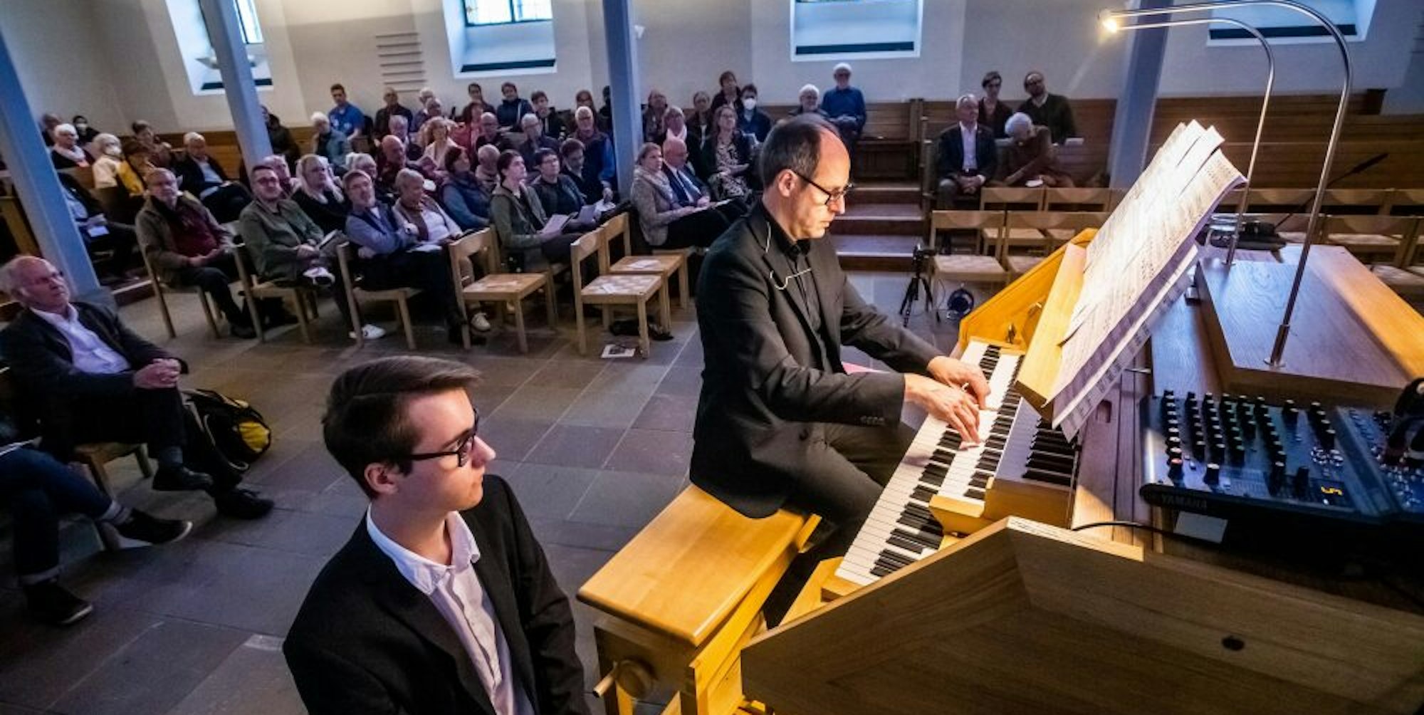 Dieser Spieltisch ist eine wahre Zauberkiste. Wenn dann Sohn Tim noch den Laptop aufklappt und die „Digital Audio Workstation“ startet, werden Geräusche hörbar, Blasen steigen auf, eine Klangwolke erhebt sich übers Schlagzeug. Das alles kann passieren mit zwei Generationen an der Orgel. Sehr großer Beifall für die „Fantasy No. 1 für Orgel und DAW“, komponiert von Sohn und Vater.