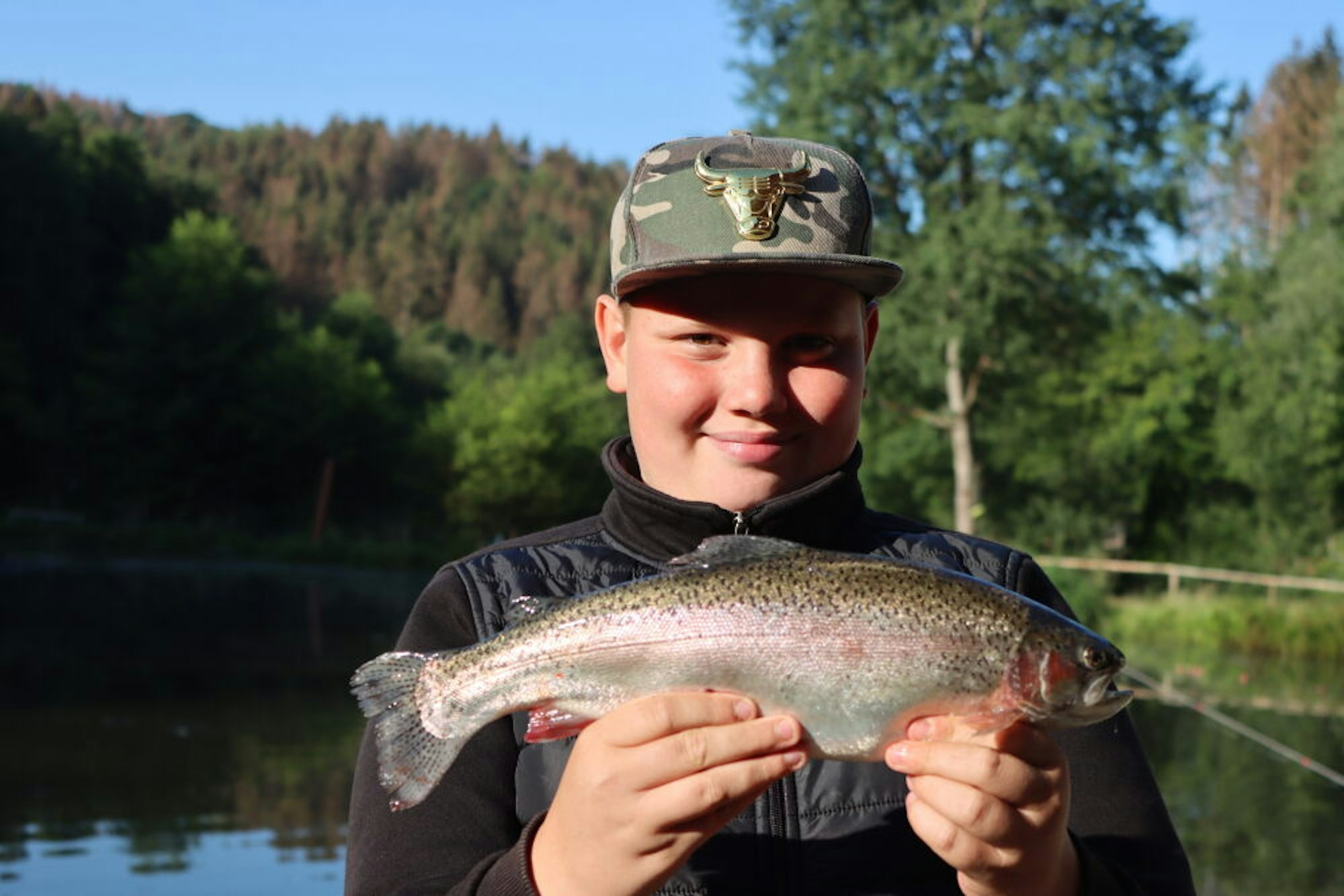 Das braucht sie Niklas Barleben aus Gummersbach nicht zu erklären: „Meinen ersten Fisch habe ich mit drei Jahren bei meinem Opa am Teich gefangen“, sagt der Zwölfjährige. „Und mit fünf habe ich meine erste Angel bekommen.“ Niklas ist oft im Angelpark, in den Ferien fast jeden Tag. Er angelt wie ein alter Hase und hat mit seinem Gummiköder gerade eine Lachsforelle herausgeholt.