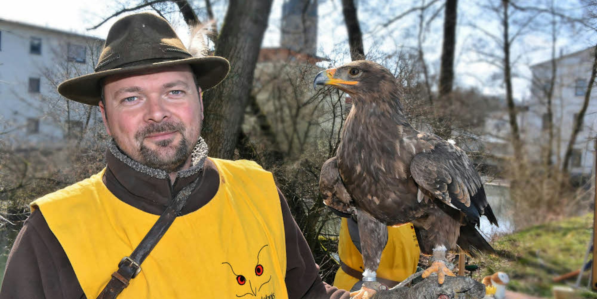 Der Steppenadler, hier beim Mittelaltermarkt am Wochenende in Wipperfürth, gehört zu den Greifvögeln, die Marco Wahl zusammen mit seinem Partner Robert Schmitz ab dem Sommer im Wiehler Wildpark zeigen will.