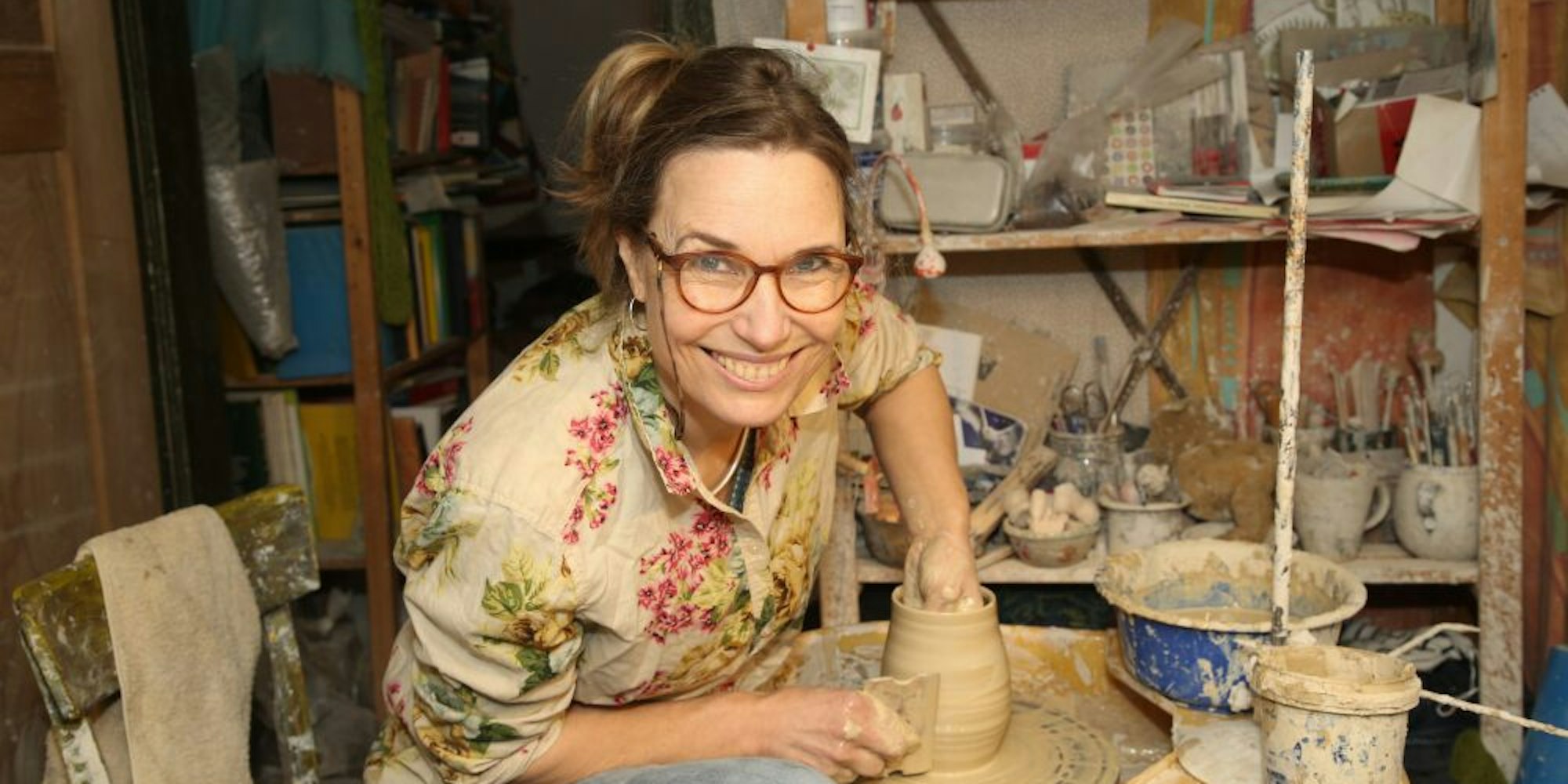 In Kontakt mit den Menschen kommt Petra Kobrow auch bei den Töpferkursen, die sie anbietet. Maximal zwei Personen führt sie in die Grundlagen der Drehkeramik ein.