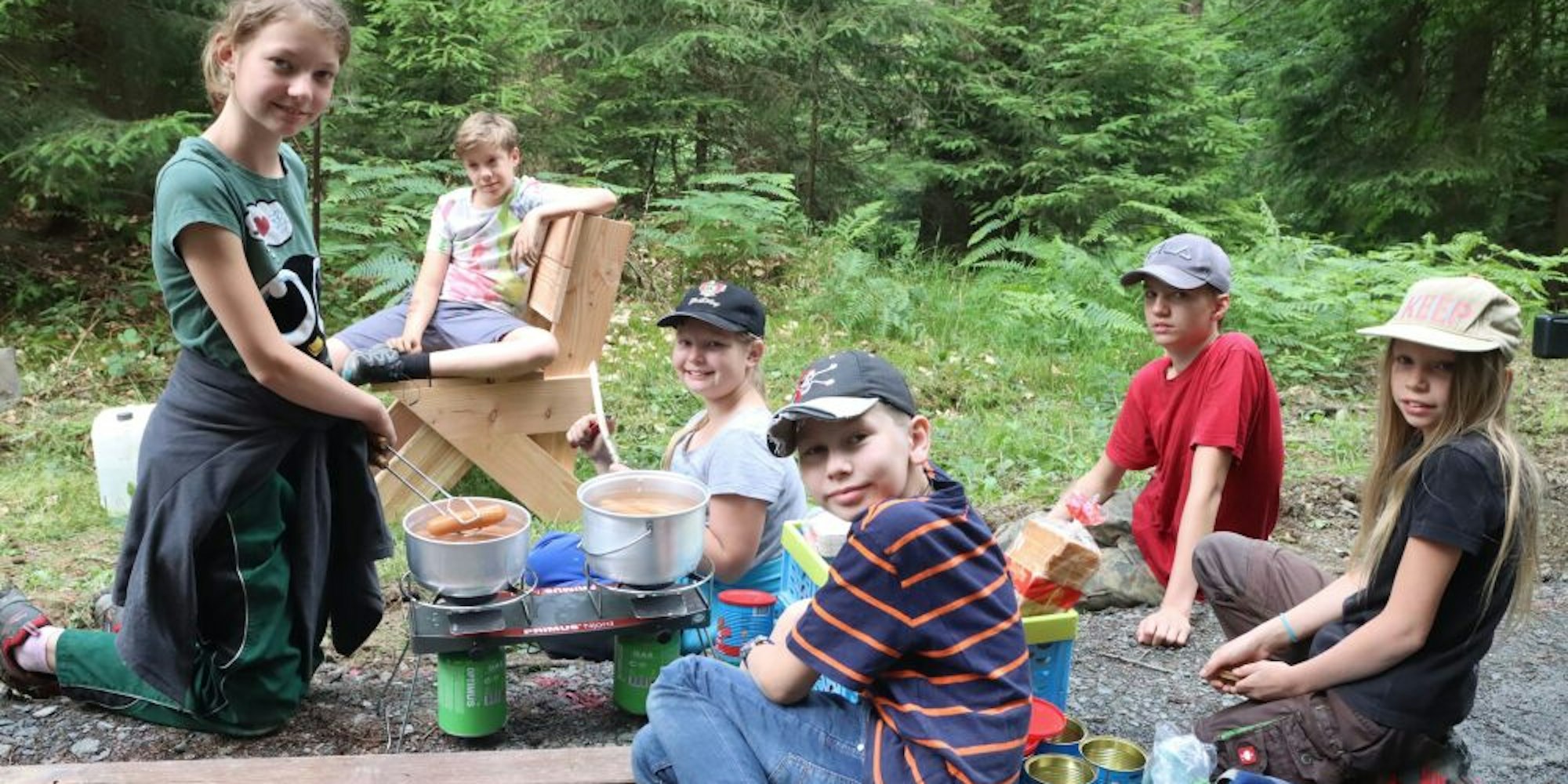 Zur Stärkung gibt es in der Mittagspause Bockwurst mit Toast und Ketchup. Die zehnjährige Feline und ihr vier Jahre älterer Bruder Niklas Schorre genießen ihren ersten Einsatz in der Waldjugend. „Wir gehen gerne in die Natur“, berichtet Niklas, Feline ergänzt: „Das Bauen hat so richtig Spaß gemacht.“