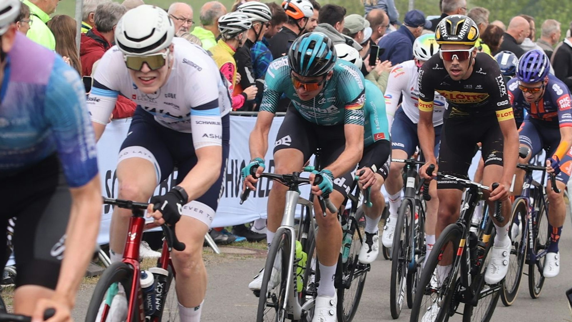 Zweimal müssen die Profis unter denen mit Julian Borresch (Mitte/türkis) auch ein Oberberger ist, das bis zu 27 Prozent steile Stück nach Agathaberg fahren.