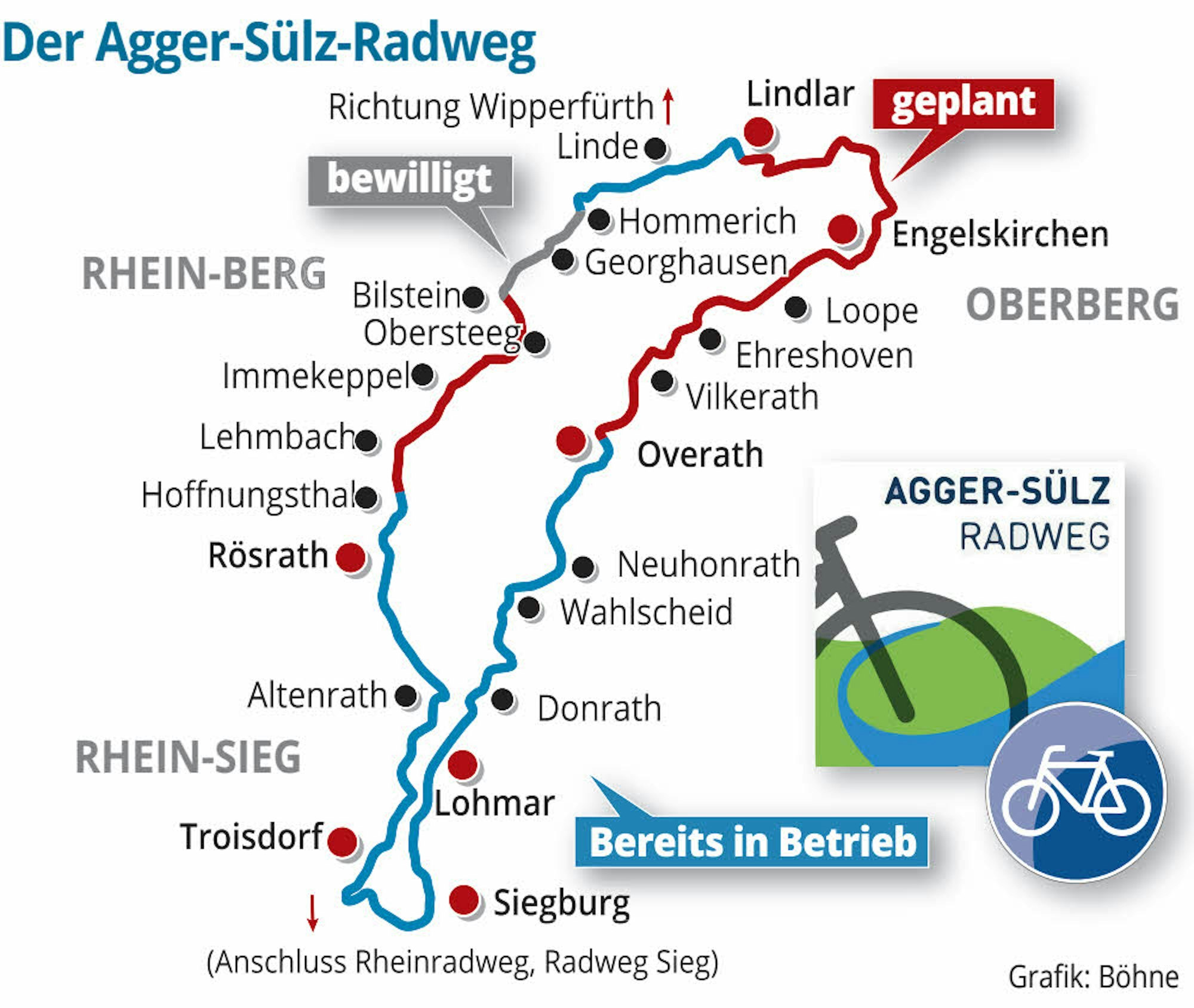 Der Agger-Sülz-Radweg soll als Rundweg auf 115 Kilometern von Siegburg und Lohmar bis nach Lindlar, Overath und Engelskirchen führen. Beteiligt sind der Oberbergische Kreis, der Rheinisch-Bergische Kreis und der Rhein-Sieg-Kreis sowie zehn Kommunen. Anfang September 2017 wurde das erste Teilstück eingeweiht. Damit der Rundweg eines Tages geschlossen werden kann, müsste die Trasse auch in Richtung Engelskirchen und von dort weiter gebaut werden. Doch wann es hier konkret weitergeht, steht noch nicht fest.