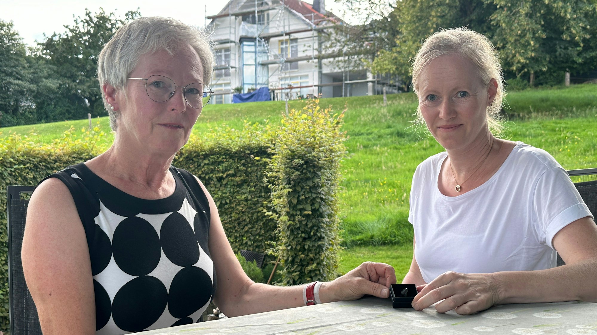 In einem Schmuckkästchen bewahren Regina Stefer (l.) und Sonja Puschmann (r.) die verformte Kugel auf. Fotos: Weitzdörfer