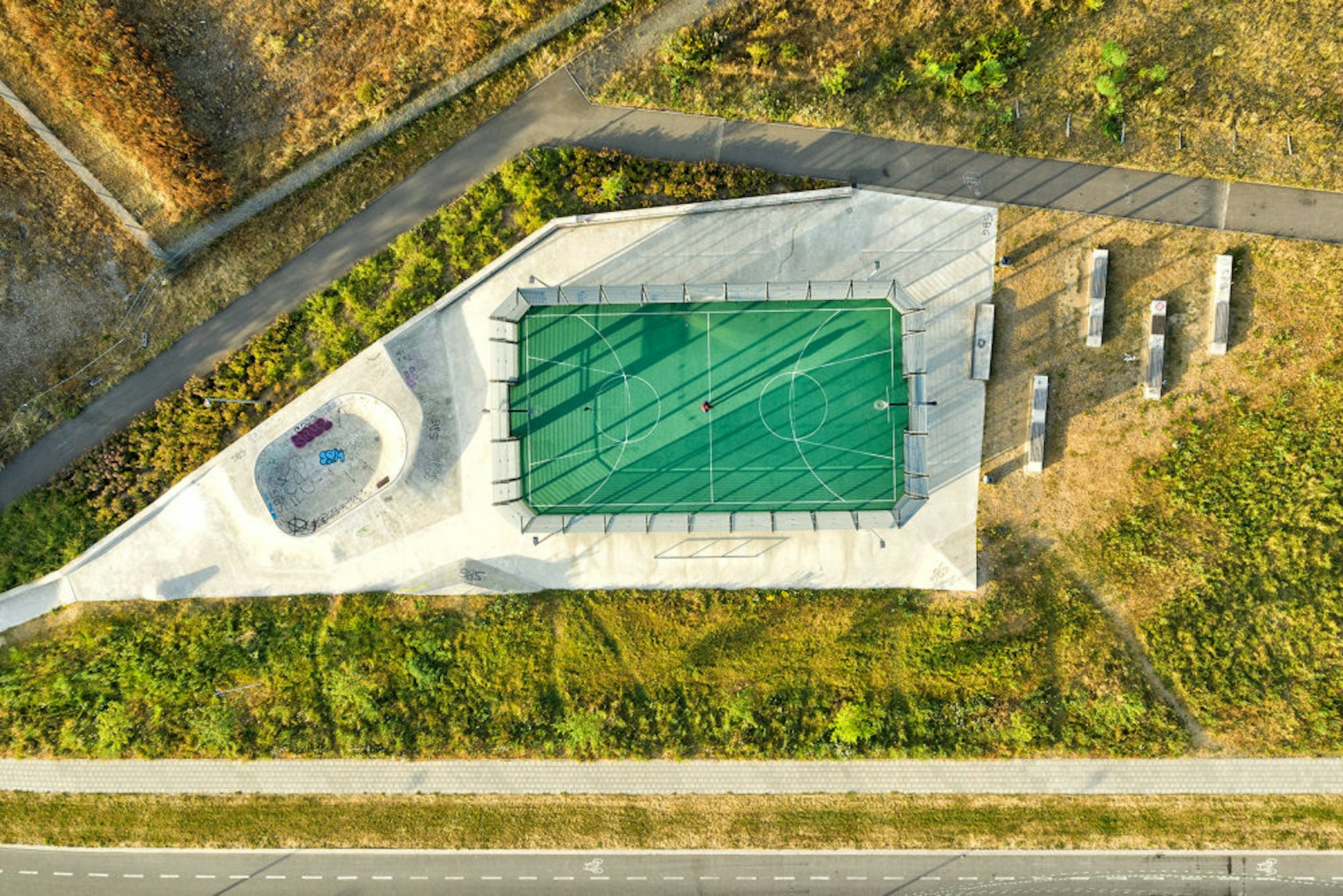 Die Drohne sieht drauf: Hier auf das Basketball-Spielfeld in der Neuen Bahnstadt.