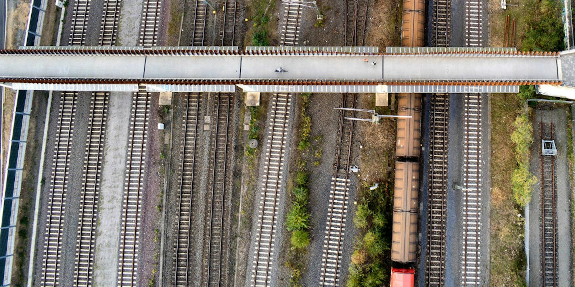 Einen völlig anderen Ansatz der Dokumentation hat Walter Goralski gewählt. In beeindruckenden Drohnenaufnahmen ermöglicht der Fotograf einen senkrechten Blick auf verschiedene Motive: Das „grüne Kreuz“, die Fußgängerbrücke über den Gleisen, Sportkäfig und Kinderspielplatz. Alle zeugen, wie die Mini-Dokus der Serie „Auf lange Sicht“, von einer neuen Lebendigkeit der ehemaligen Brachflächen. Auch die Straßen und Wege der Neuen Bahnstadt hat Goralski zu verschiedenen Tageszeiten fotografiert, zudem hat er in Infrarot-Aufnahmen die verschiedenen Grünzonen fokussiert: „Das liegt ästhetisch jenseits von Dokumentaufnahmen“, erklärt Projektleiter Hendrik Neubauer, der selber leidenschaftlicher Fotograf ist.