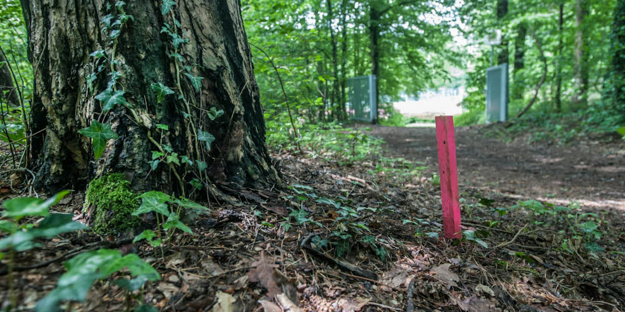 Ein gutes Jahr, bevor die Rodungsarbeiten voraussichtlich im Winter 2020 beginnen sollen, haben Landvermesser die sprichwörtlichen Pflöcke in den Waldboden nahe der Waldsiedlung geschlagen und den Verlauf markiert. Kurz darauf soll das 90-Zentimeter dicke Rohr 1,20 Meter tief unter der Erde verschwinden.