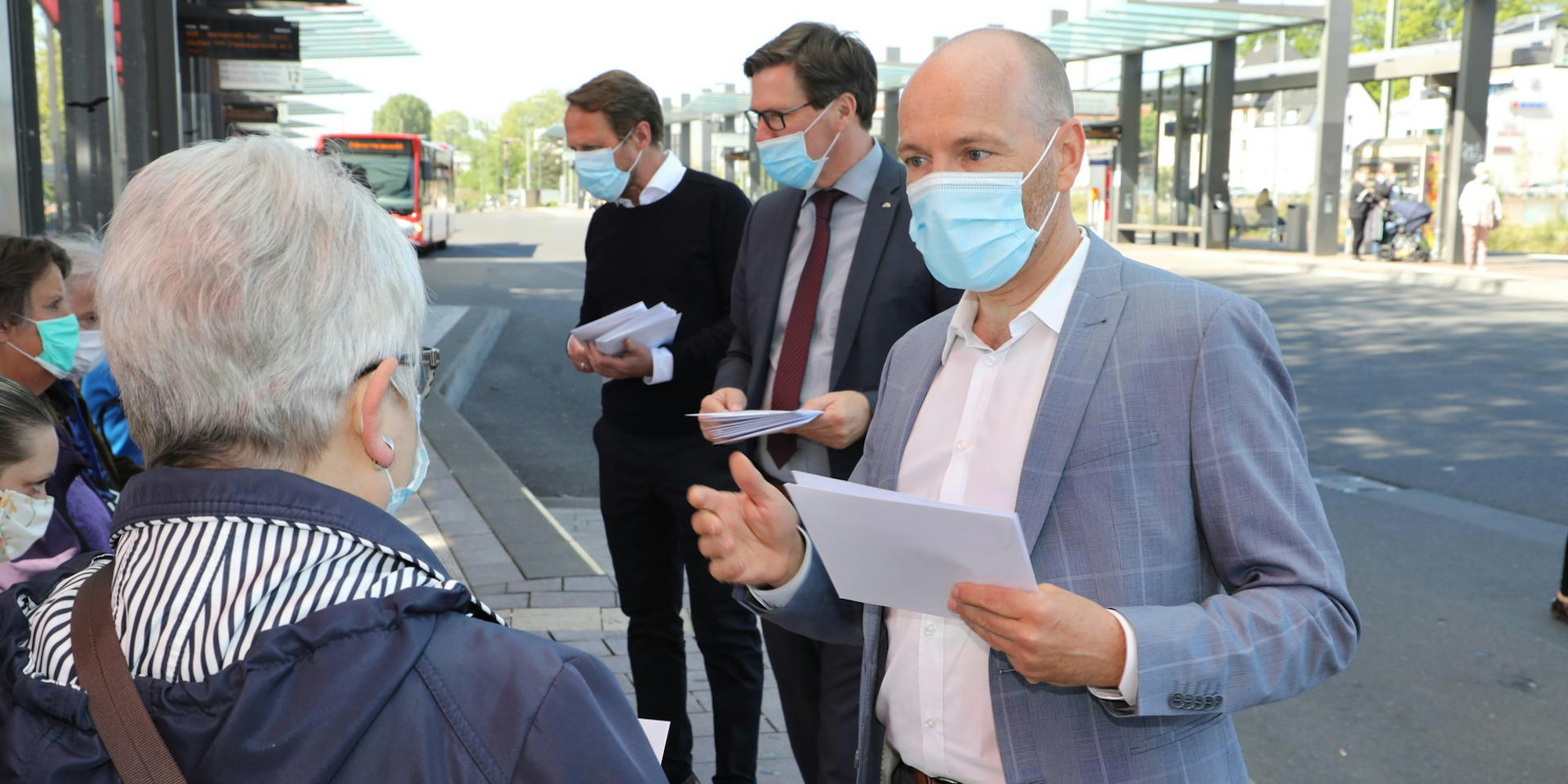 Für die Maskenpflicht in Bussen warben bereits im Mai 2020 (v.r.) Wupsi-Chef Marc Kretkowski, Landrat Stephan Santelmann und Leverkusens OB Uwe Richrath gemeinsam.
