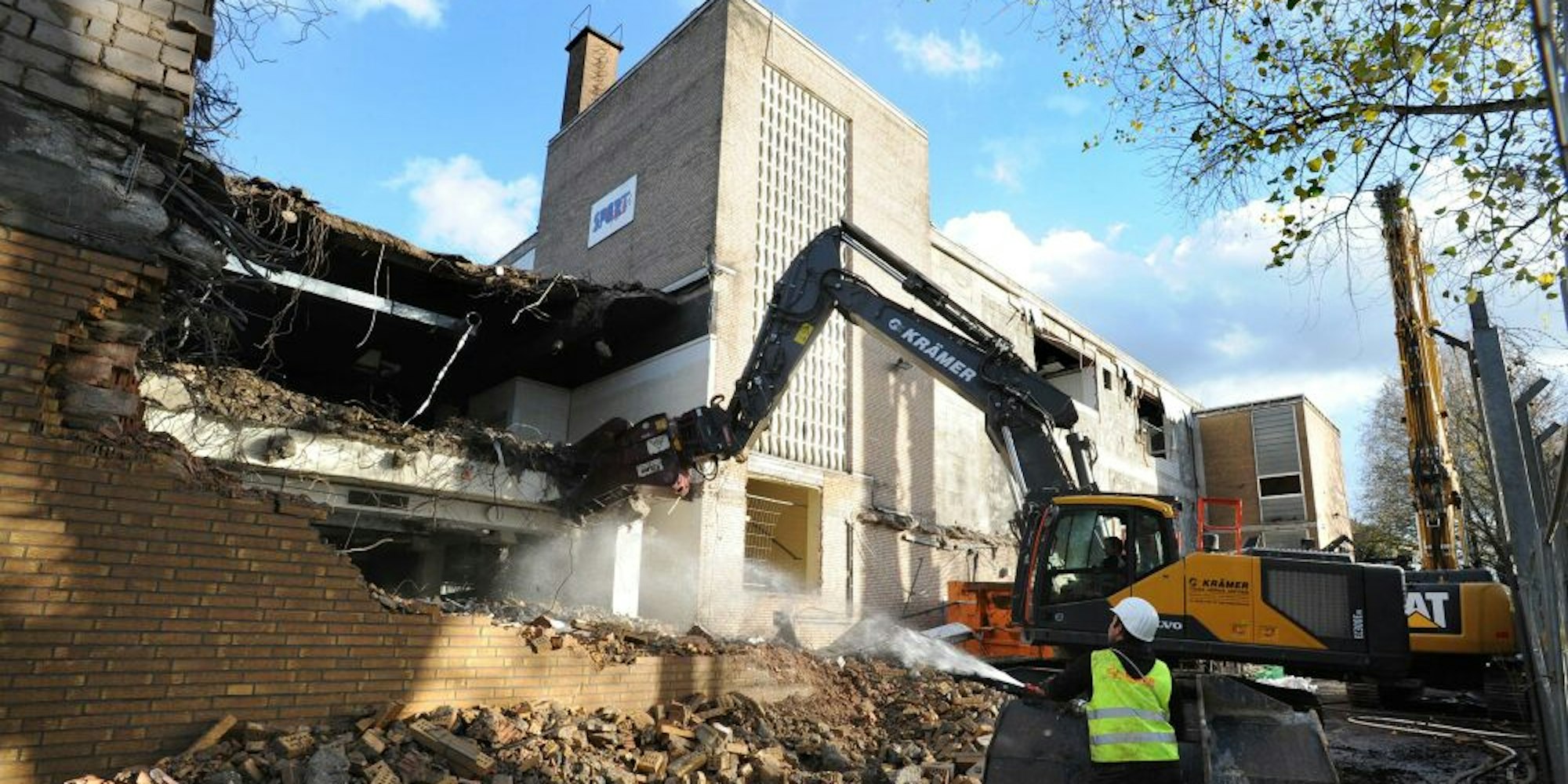 In der Nacht zu Donnerstag ist ein Longfront-Bagger an der Baustelle angeliefert worden, der mit seinem besonders langen Ausleger dazu geeignet ist, das frühere Kaufhaus auch vom Dach her zu zertrümmern. Er wird, sagte Krämer auf Anfrage des „Kölner Stadt-Anzeiger“, aber erst nächste Woche zum Einsatz kommen und steht derzeit noch auf der Rückseite geparkt. Dort, am einstigen Getränkelager-Hof, läuft die Betonzerkleinerung bereits. Mit Duschen aus Wasserschläuchen wird der Abbruch-Staub niedergeschlagen.