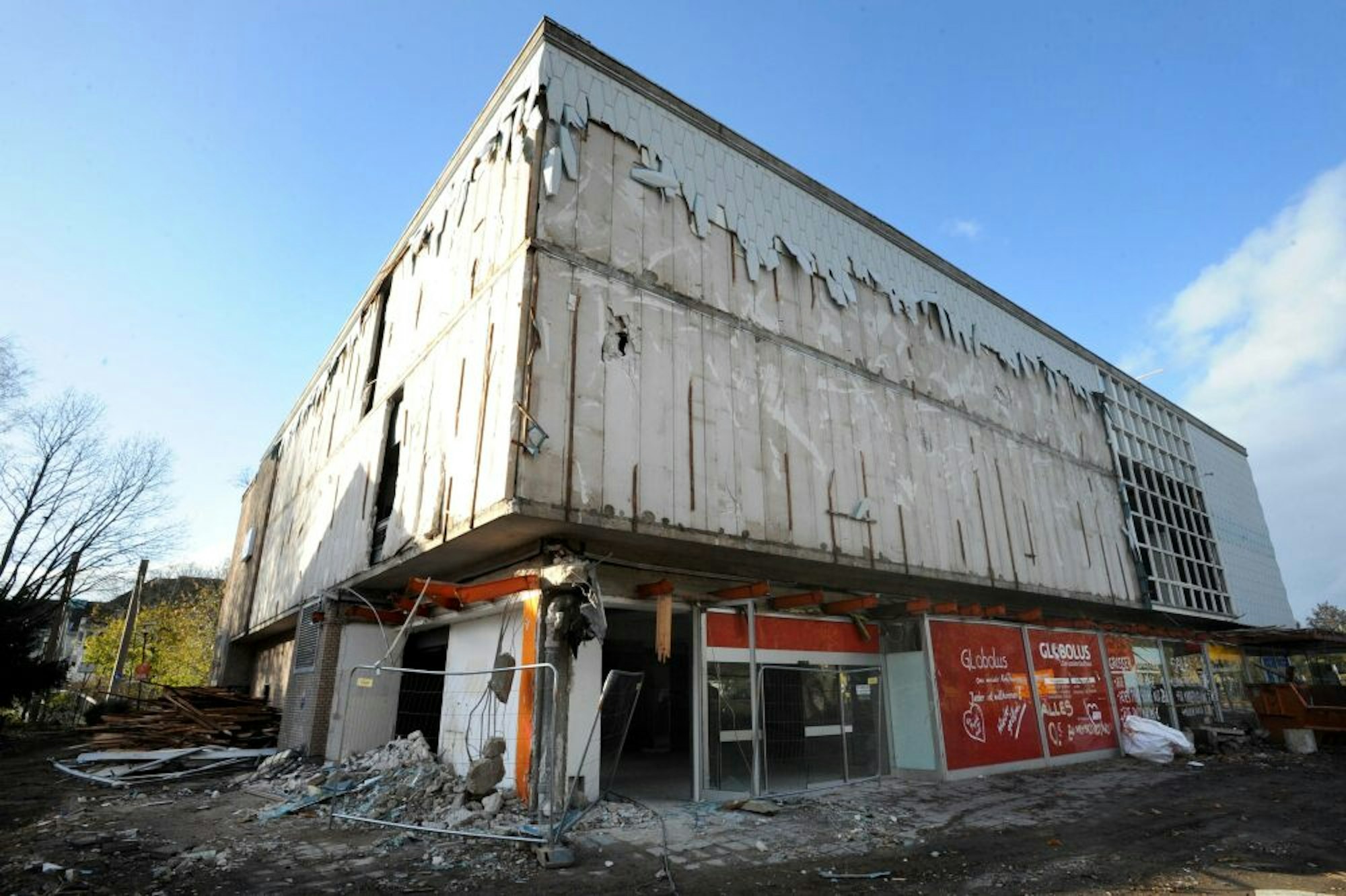 Die in der Stadt bekannte blaue Fassade des früheren Kaufhauses, in dem zuletzt der Sozial-Laden Globolus untergebracht war, ist bereits fast rundum verschwunden.