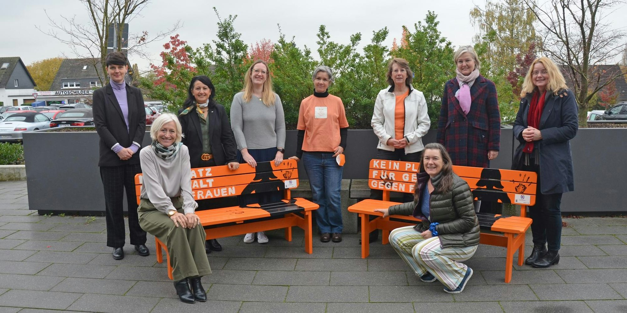 Die Akteurinnen des Runden Tischs „Keine Gewalt an Frauen“ auf den orangefarbenen Bänken: Vorn links Anja Möldgen, die Gleichstellungsbeauftragte des Kreises, in der Mitte ihre Amtskollegin aus Leichlingen, Nadja Kischka-Wellhäußer.