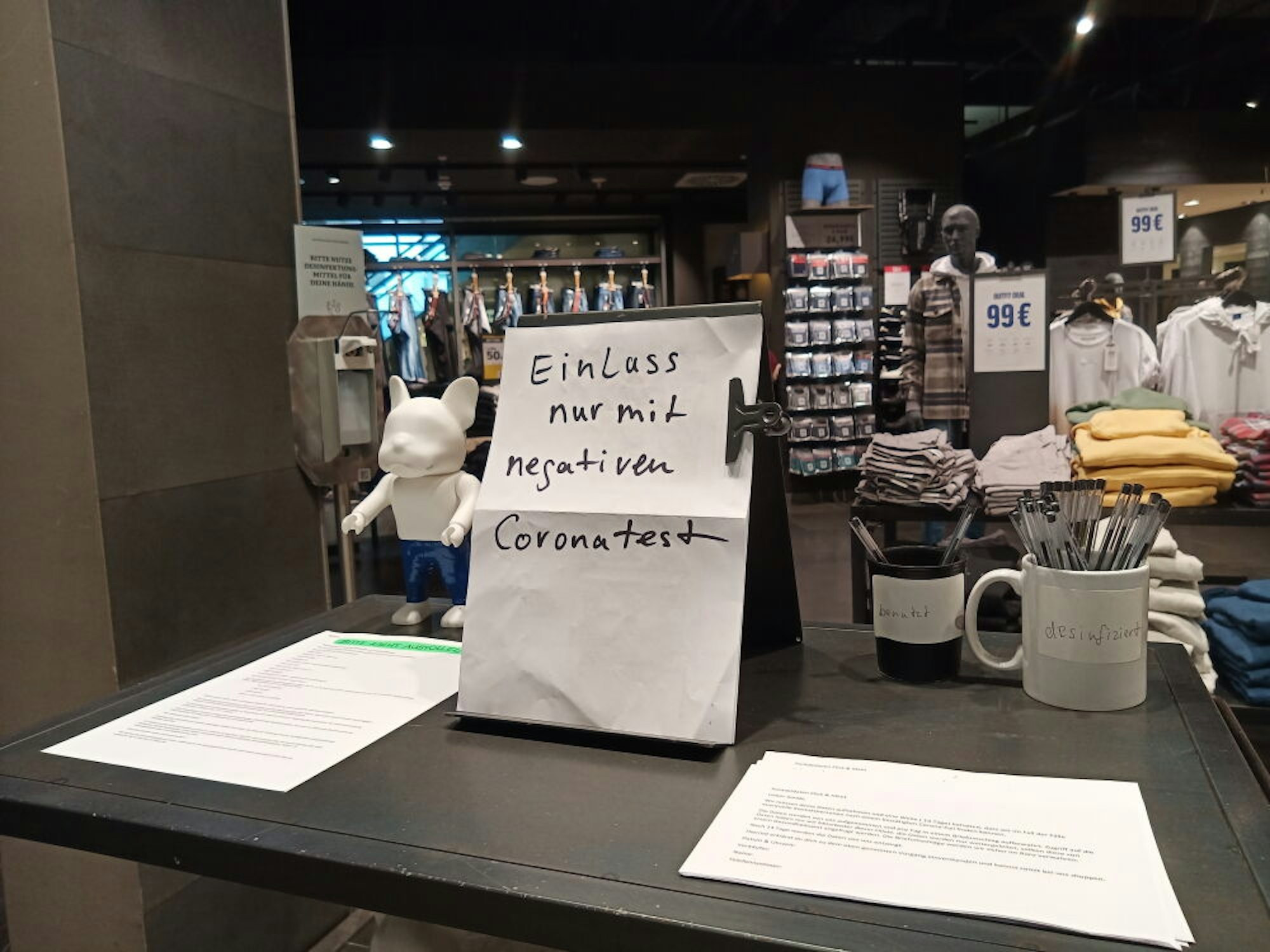Das fragt sich auch eine Mitarbeiterin von Jack und Jones, sagt sie. Nicht ein Mensch hat an diesem Morgen den Laden betreten. Was sie von der Testpflicht hält? „Das will ich gar nicht laut sagen. Für uns ist das natürlich sehr ungünstig.“ Schon vorher seien kaum Menschen in das Geschäft gekommen, wo nach der Corona-Schutzverordnung nur vier Personen gleichzeitig drin sein dürfen „In den letzten Tagen hatten wir teilweise einen Umsatz von unter hundert Euro.“ Das lohne sich nicht, sagt sie. Ihre Chefs würden nun darüber beraten, wie sie mit der Situation weiter umgehen wollen.