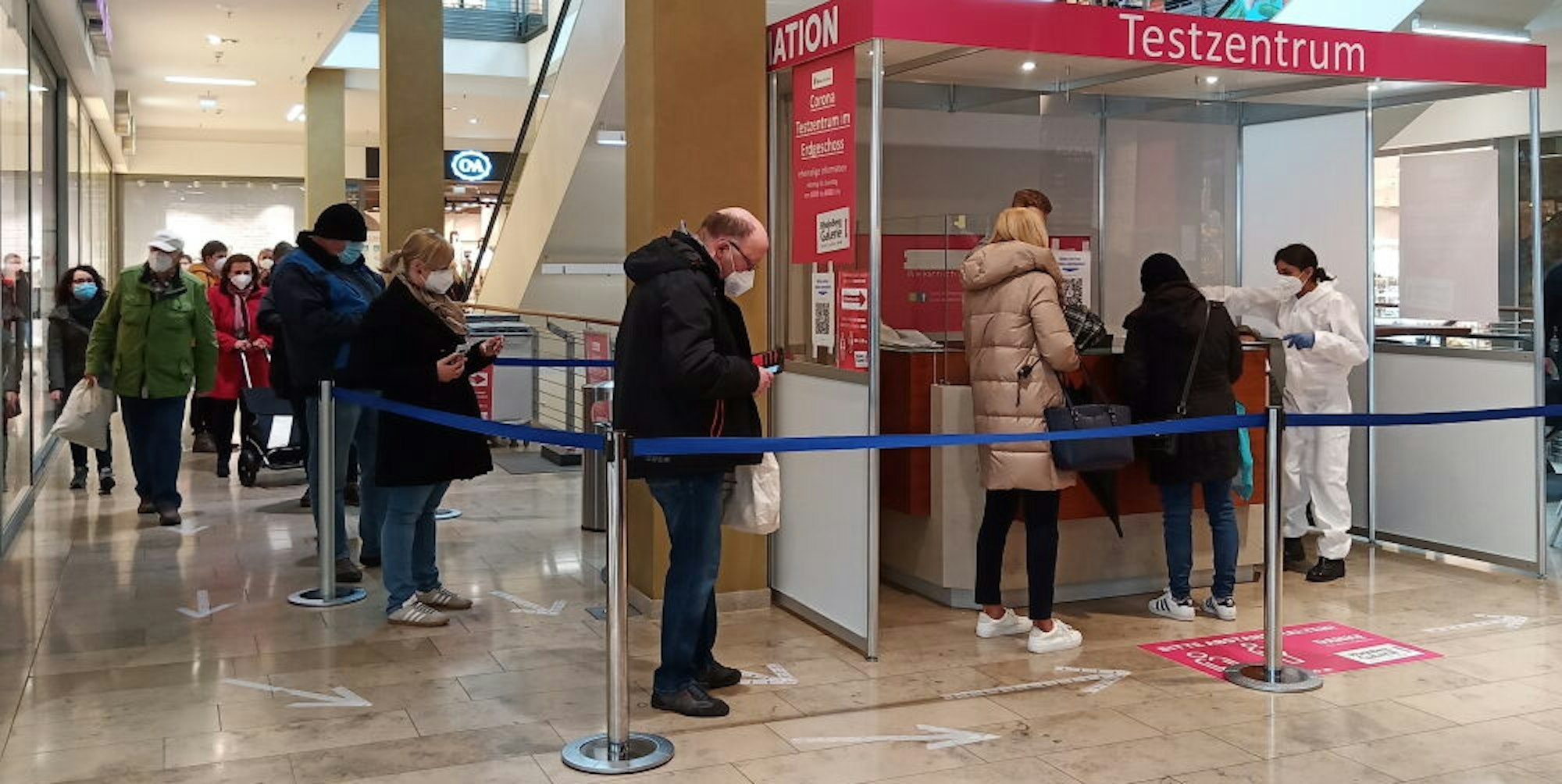 Die Schlange vor dem Testzentrum in der Rhein-Berg-Galerie wird am Mittwochmorgen stetig länger.