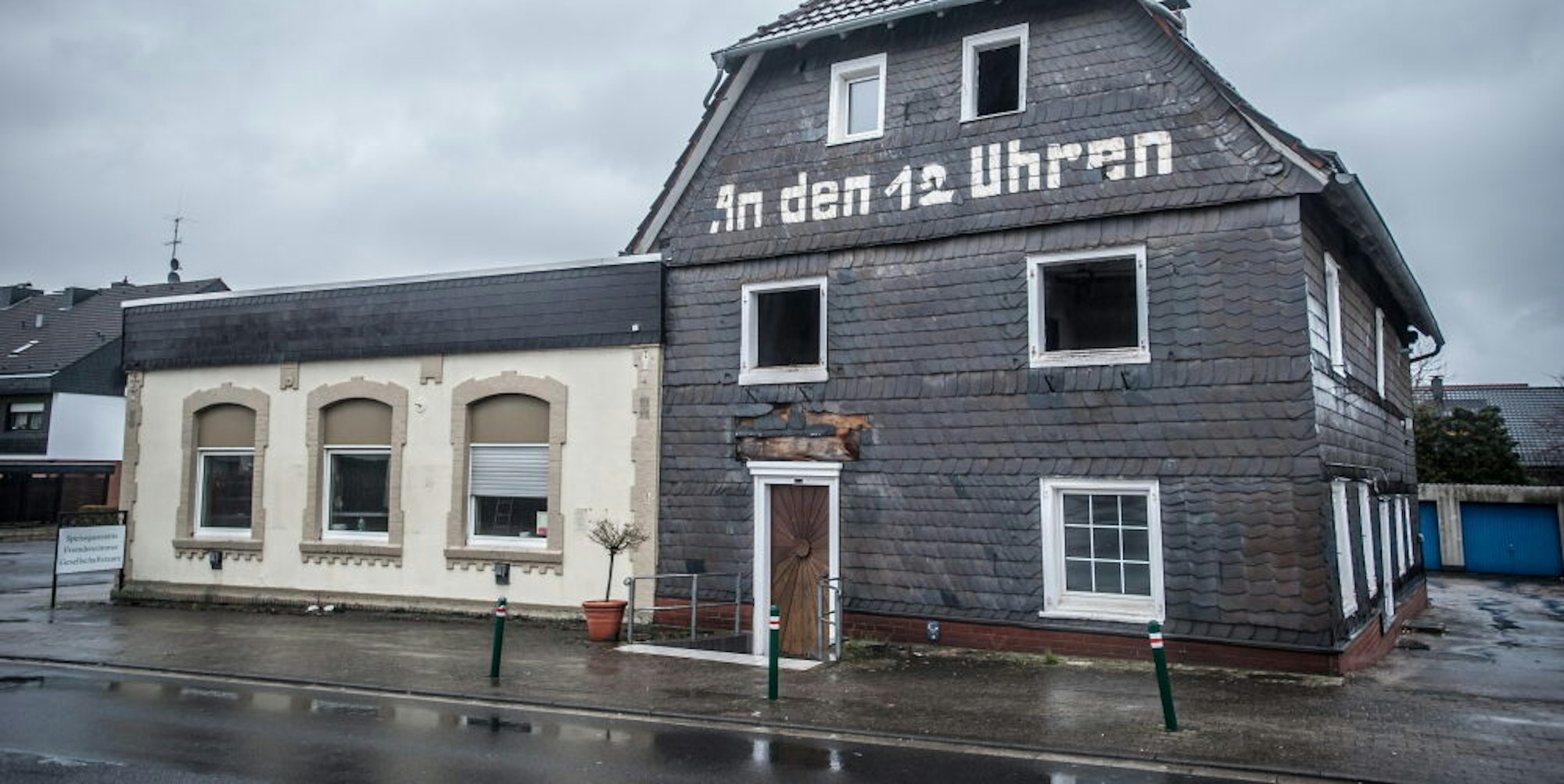 Leichlingen – Die berühmte Uhr, die hoch oben an der Schieferfassade hing und ständig auf 12 zeigte, ist schon weg. Auch die Fenster sind raus, Zwischendecken eingestürzt, Schankraum, Saal und die drei Gästezimmer voller Schutt, alle Werbeschilder am Eingang abmontiert.