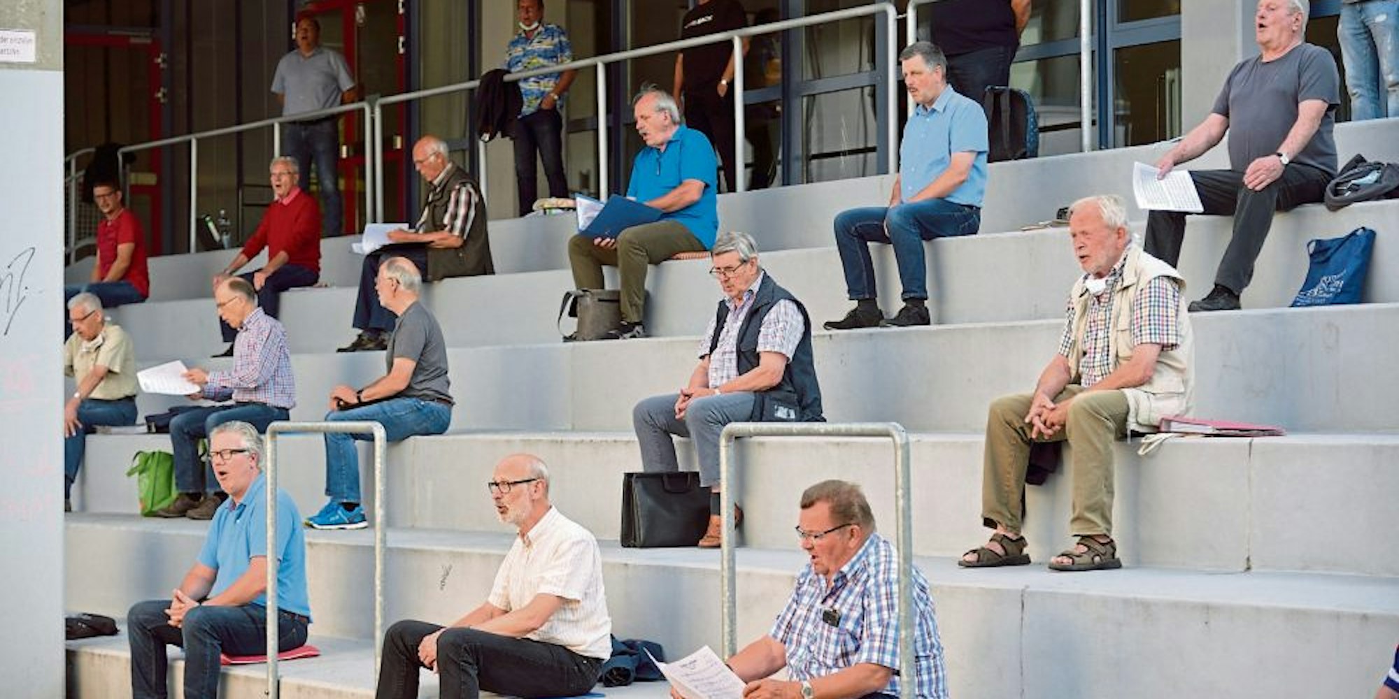 Begrüßt wird sich bei der Probe per Ellenbogencheck. Die Sänger sitzen auf den Treppenstufen vor der Schule – mit genügend Abstand zum Nebenmann. Links die hohen Tenorstimmen, ganz rechts der tiefe Bass. Wer sich gut vorbereitet hat, hat ein Sitzkissen dabei. Wer keinen Platz auf den Treppenstufen findet, muss, wie Andreas Laumann, ganz oben in der hinteren Reihe stehen. „Wir sind noch jünger, wir überlassen die Sitzplätze auf der Treppe der älteren Generation“, sagt Laumann schmunzelnd. Vorsichtshalber hat er einen Campingstuhl mitgebracht.