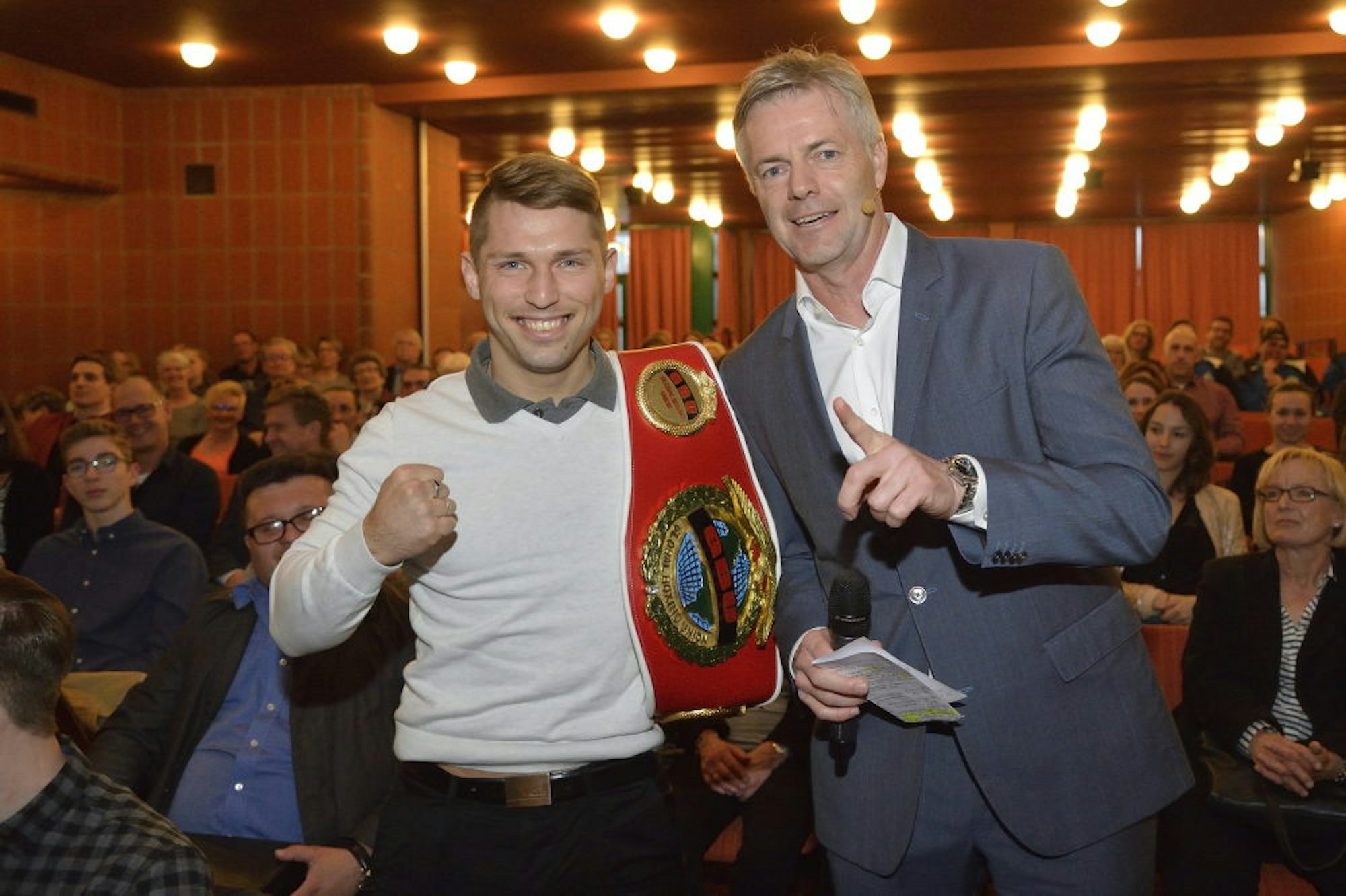 Sergej Wotschel (l.) mit Moderator Tom Bartels bei der Sportlerehrung des Kreises. Den EM-Gürtel hatte er mitgebracht.