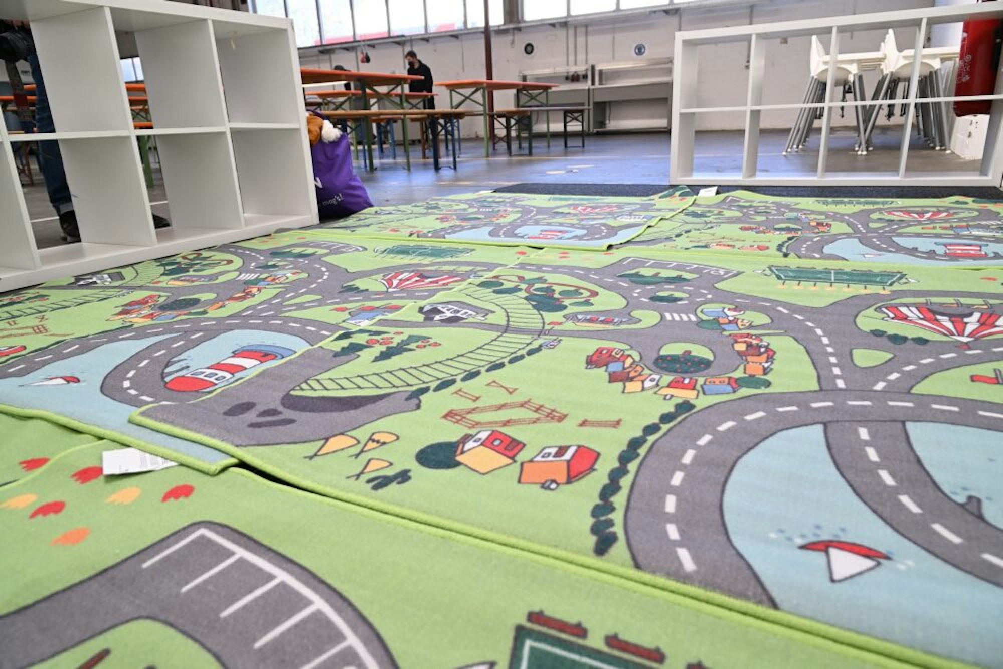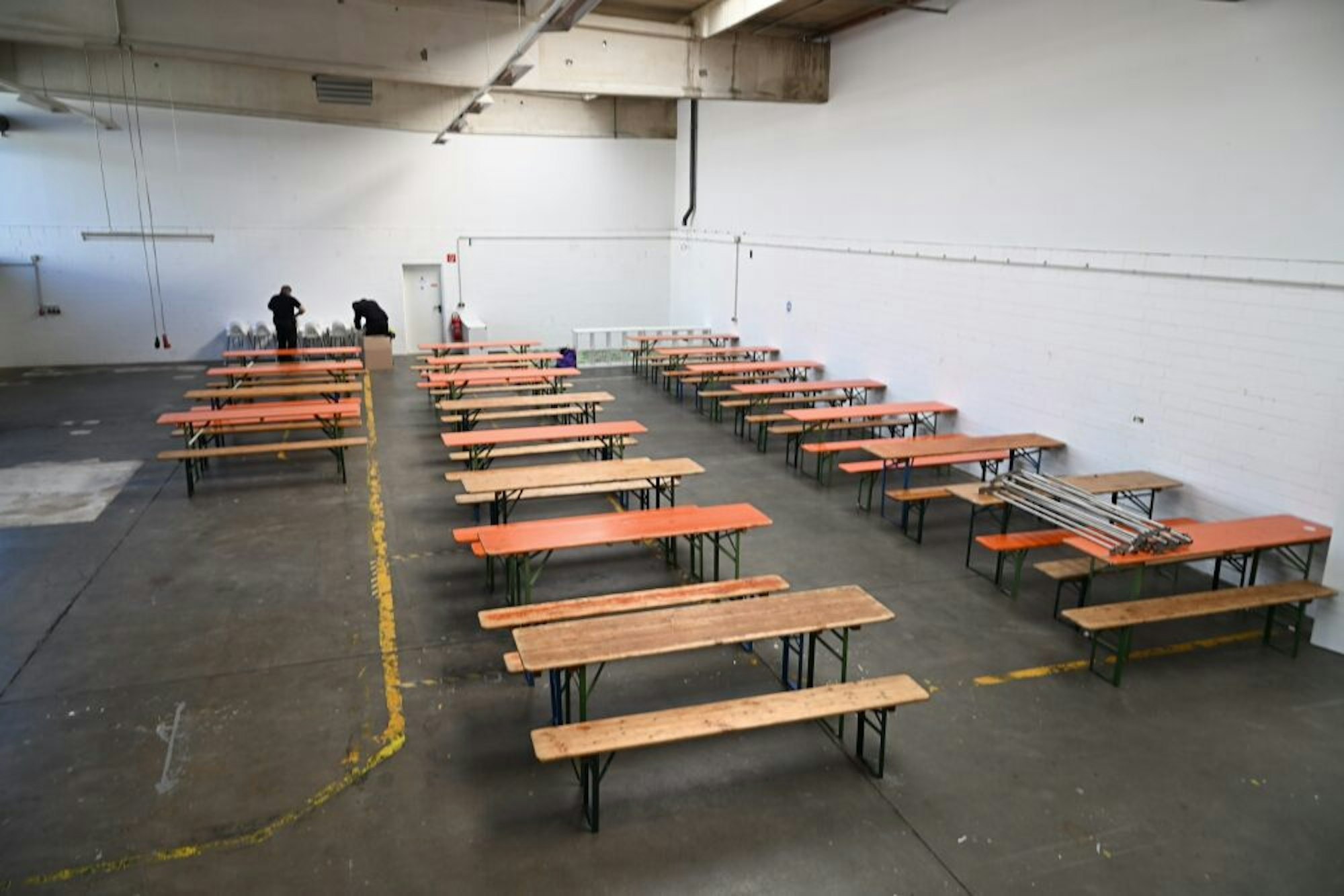 Ein erster Arzt trifft ein, sucht das frisch hergerichtete Untersuchungszimmer. Feuerwehrleute haben bereits Tische aufgestellt, „Willkommen“-Plakate auf Ukrainisch hängen an den Wänden. Nebenan sind Feuerwehrfrauen und -männer damit beschäftigt, weitere Trennwände in der großen beheizten Halle aufzubauen, Doppelstockbetten zu montieren und Matratzen zu verteilen.