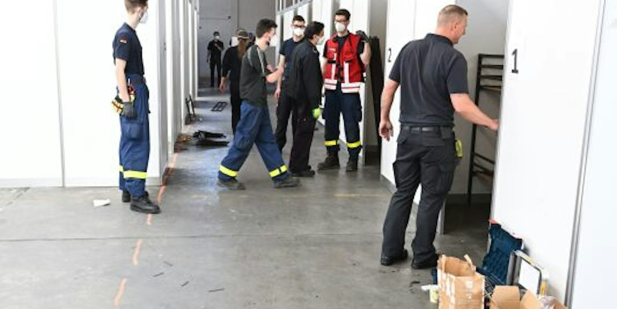 Die zwischen den Trennwänden entstandenen Räume wurden mit Feldbetten und anderem Mobiliar ausgestattet, um den Menschen auf diese Weise zumindest etwas Privatsphäre zu ermöglichen. „Auf den drei mal sechs Metern können dann erstmal bis zu vier Geflüchtete unterkommen“, erläutert David Pleiß vom Löschzug Paffrath/Hand, der die Arbeiten in der Halle koordiniert hat.
