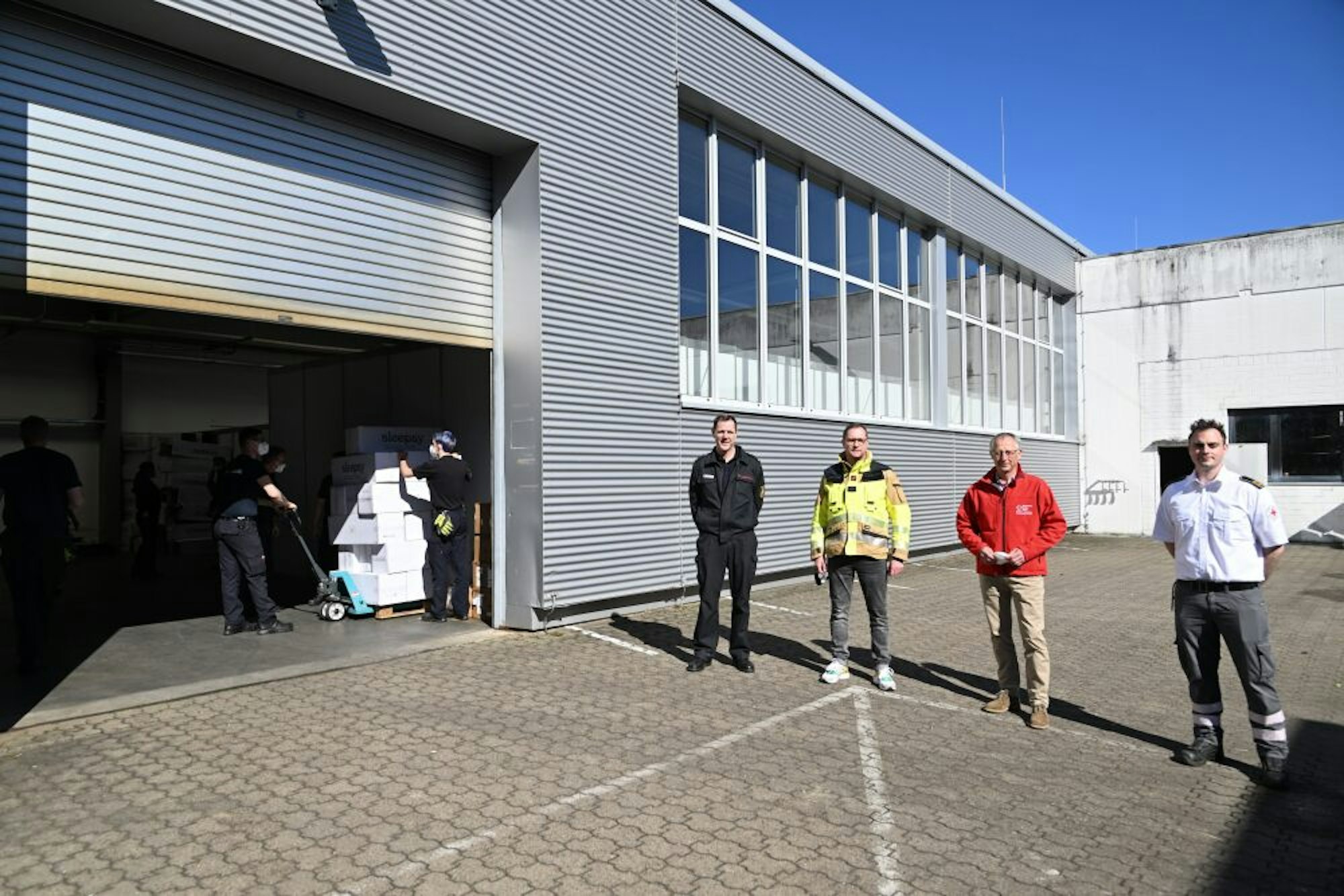Am Halleneingang: (v.l.) Feuerwehr-Chef Jörg Köhler, SAE-Leiter Thore Eggert, DRK-Geschäftsführer Reinhold Feistl, Steffen Schmidt (DRK).