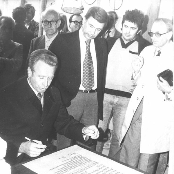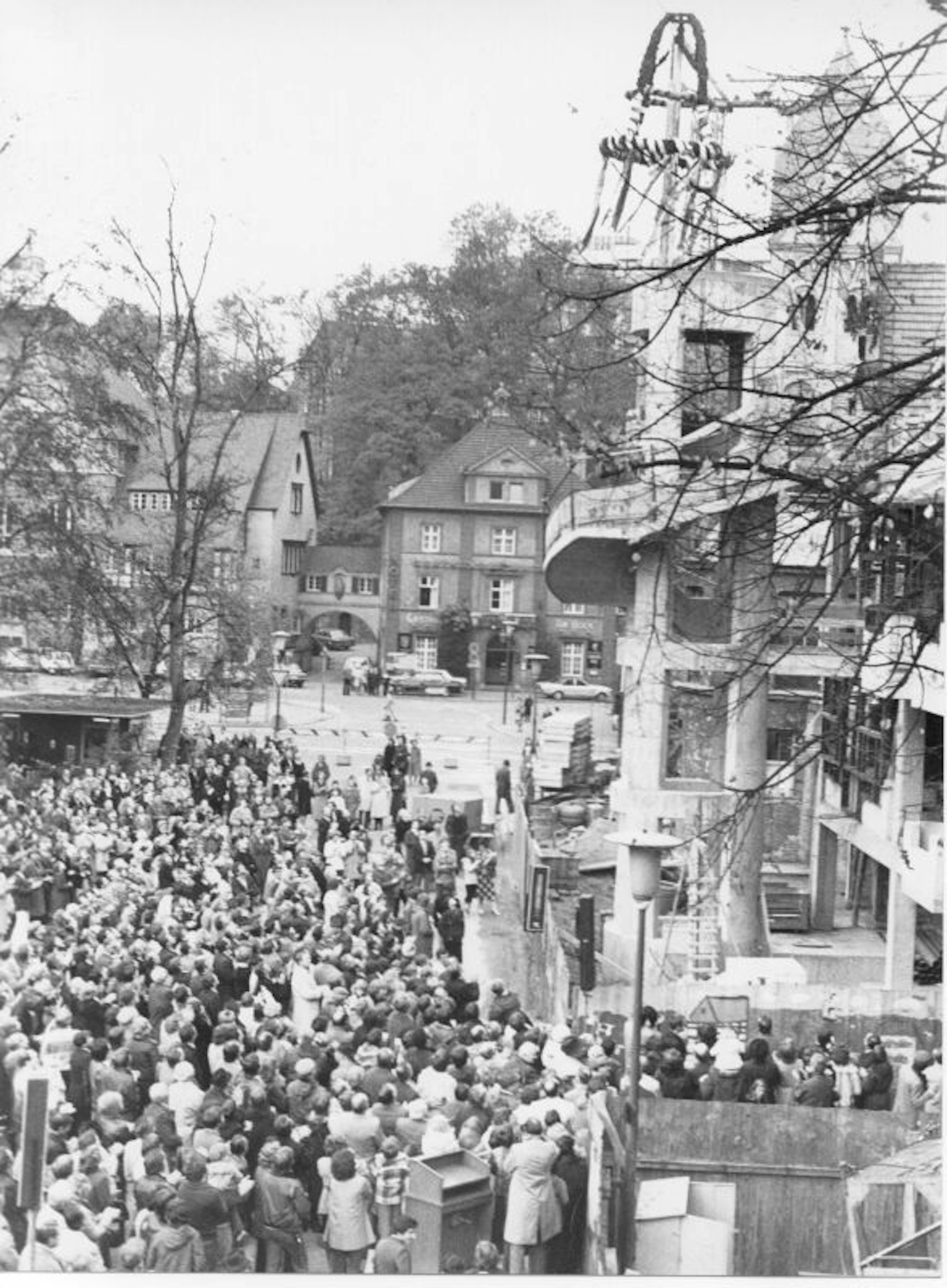 Der Bergische Löwe beim Richtfest des Böhm-Neubaus 1978.