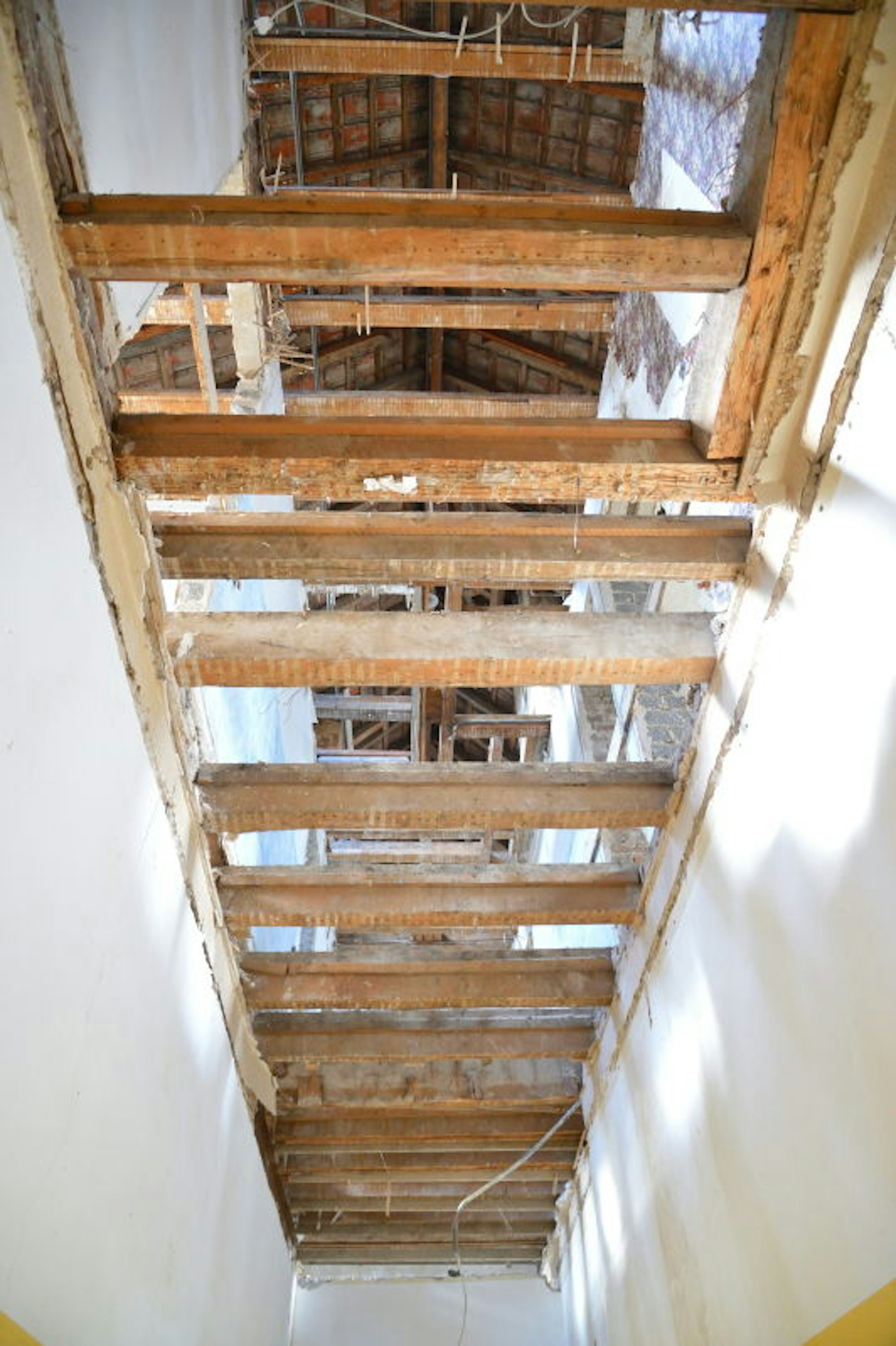 „Der kürzeste Weg zwischen Menschen ist ein Lächeln“ – die Worte sind noch auf den ockergelben Kacheln im Flur der ehemaligen Behörde zu lesen. Ansonsten ist das Hausinnere völlig kahl. Die alten Holzbalken zwischen den Geschossen liegen frei. Vom Erdgeschoss kann man direkt bis unters Dach sehen.