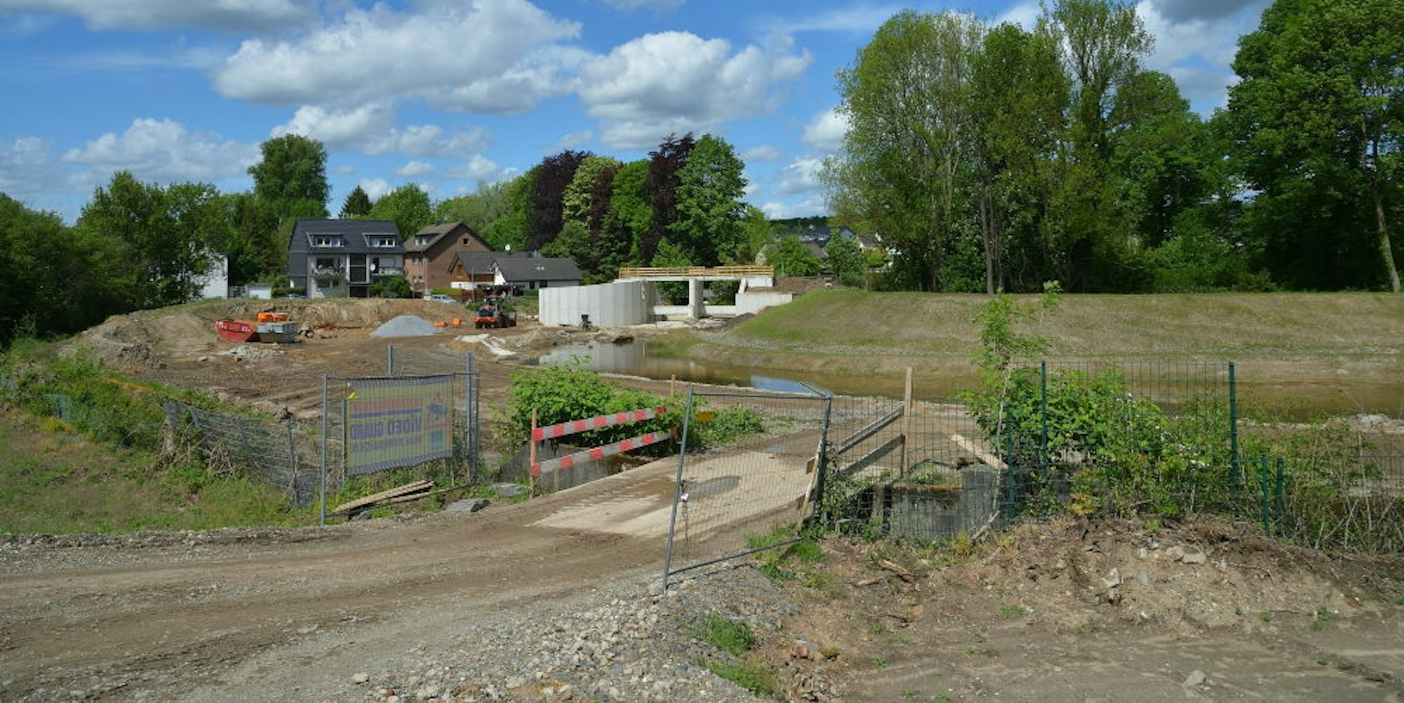 Nun kommen die Arbeiten in die nächste Phase: Der Zulauf zum neuen Becken muss umgestaltet werden. Unter anderem geht es um den Anschluss des Strundebaches und um einen Sandfang, der neu errichtet wird.