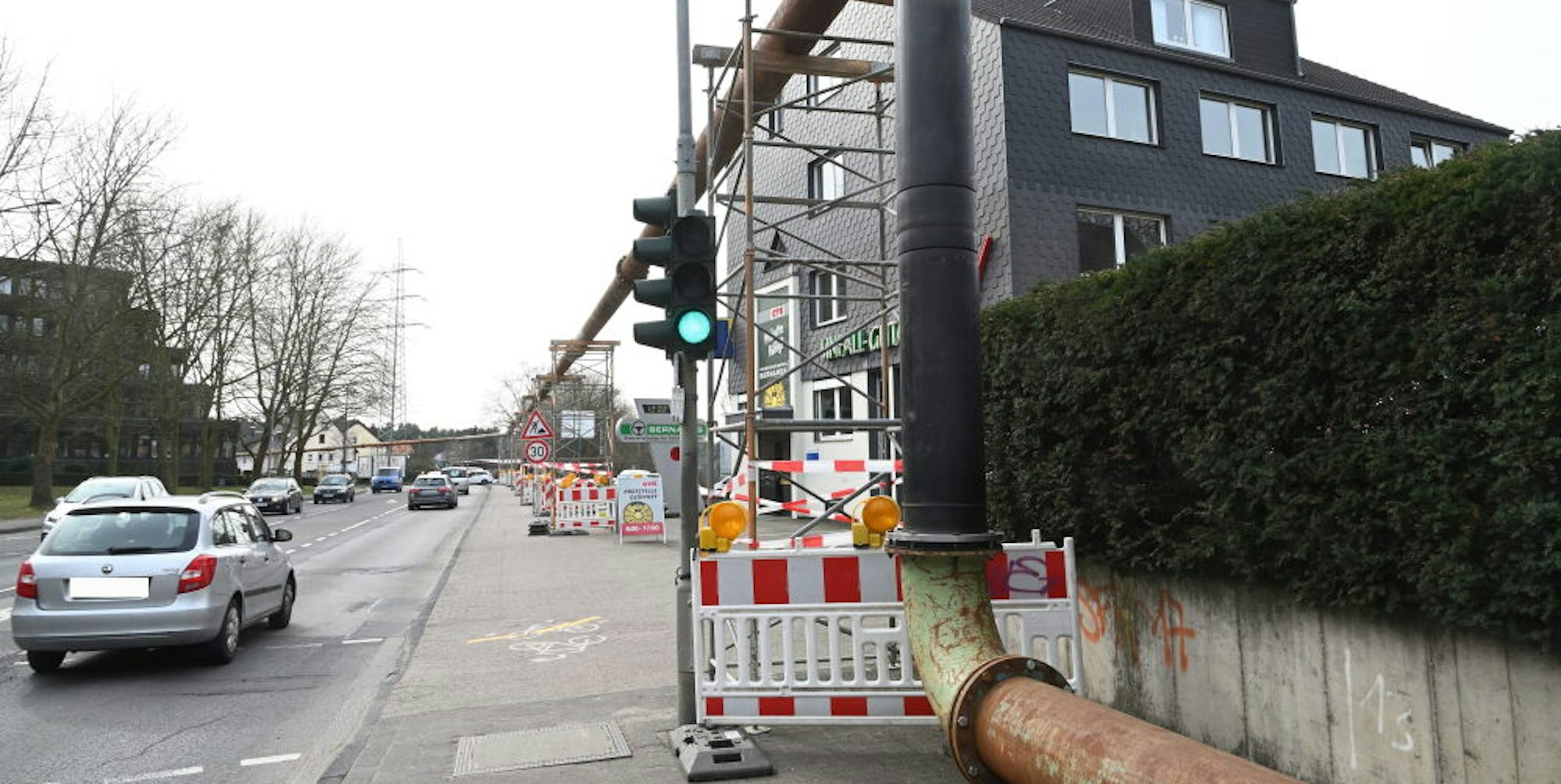Nicht zu übersehen sind die oberirdischen Rohre, wie hier am Refrather Weg.