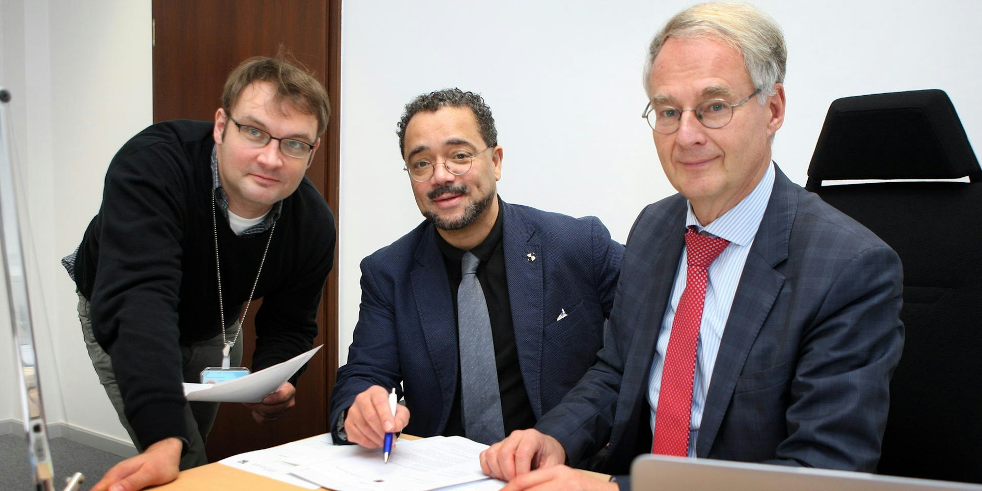 Fabian Schütz (l) mit AfD-Bundestagsabgeordnete Professor Dr. Harald Weyel (m.) und Dr. Roland Hartwig.