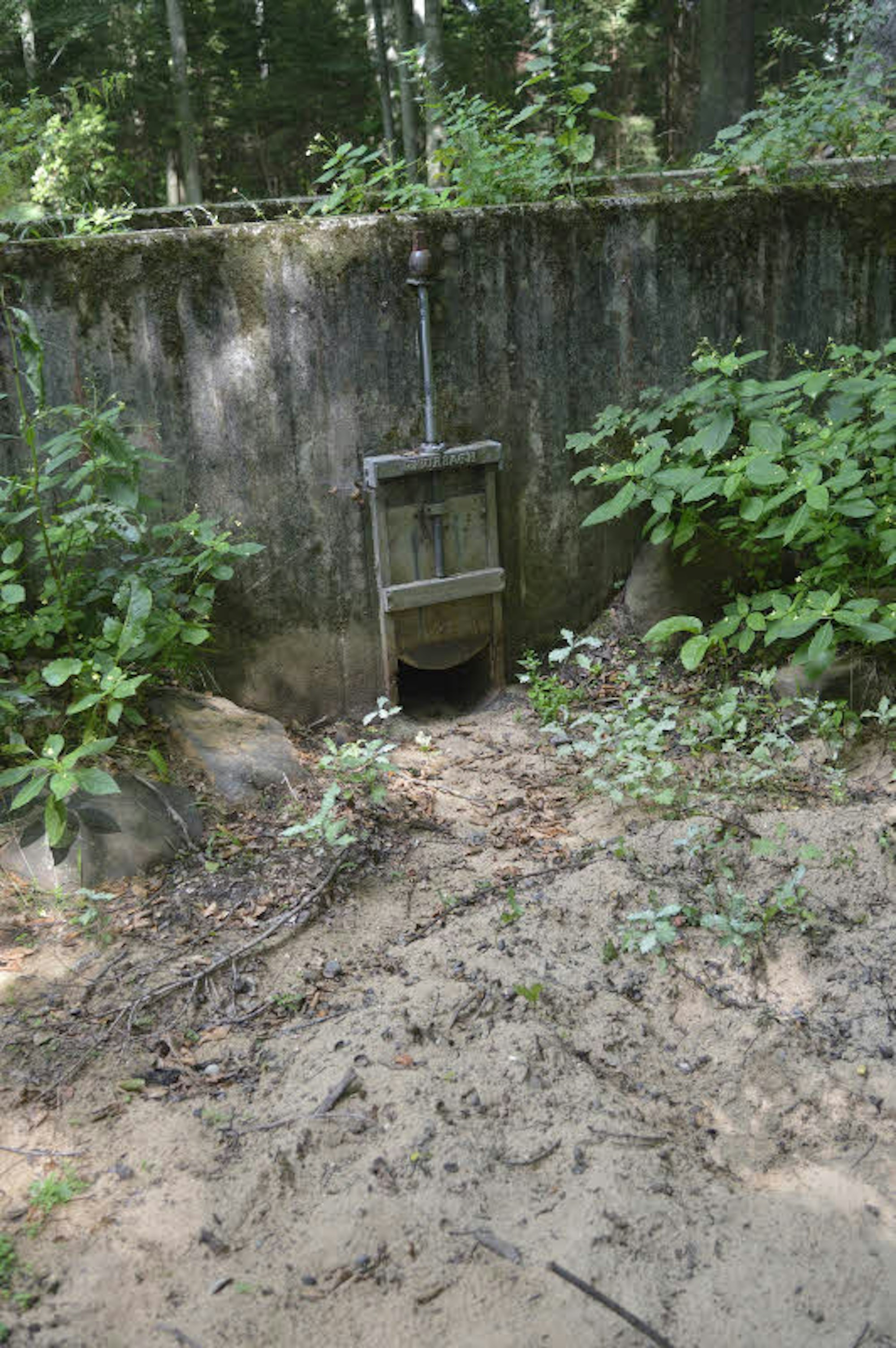 Durch diese Öffnung am Sperrschieber fließt der Hasselsbach. Wasser ist hier weit und breit nicht zu sehen.