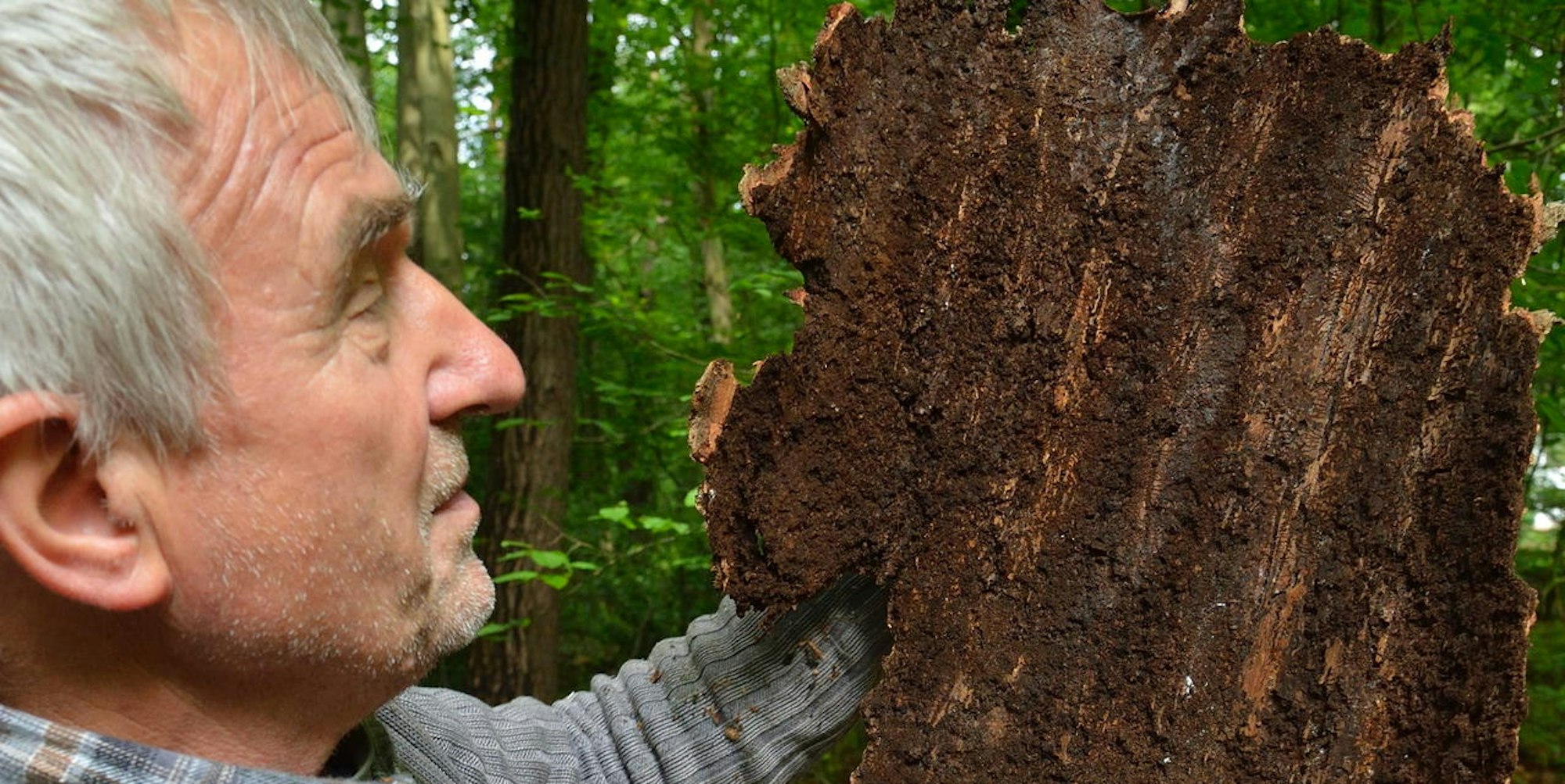 Er frisst und frisst und frisst: Wenn der Borkenkäfer zuschlägt, hinterlässt er tote Bäume. Forstunternehmer Franc Godler begutachtet ein Stück abgefallene Rinde.