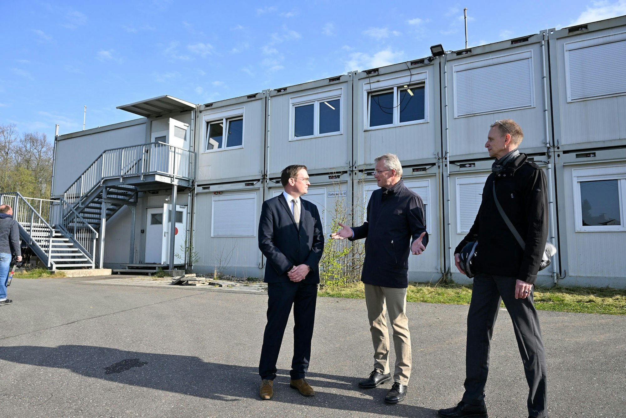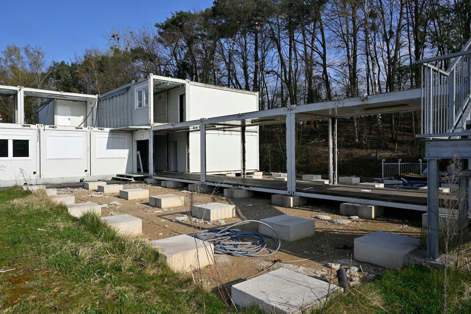 „Wir müssen uns aber darauf einstellen, dass die Krise erstmal zur Normalvorstellung wird“, meint Stein. Deshalb soll ein weiterer Container-Riegel als Puffer im hinteren Teil des Geländes in Richtung Wald ertüchtigt werden. Als Gerippe stehen die Bauten da, Bodenplatten und Seitenwände fehlen noch. 50 Menschen sollen dort ein Dach über dem Kopf finden können.