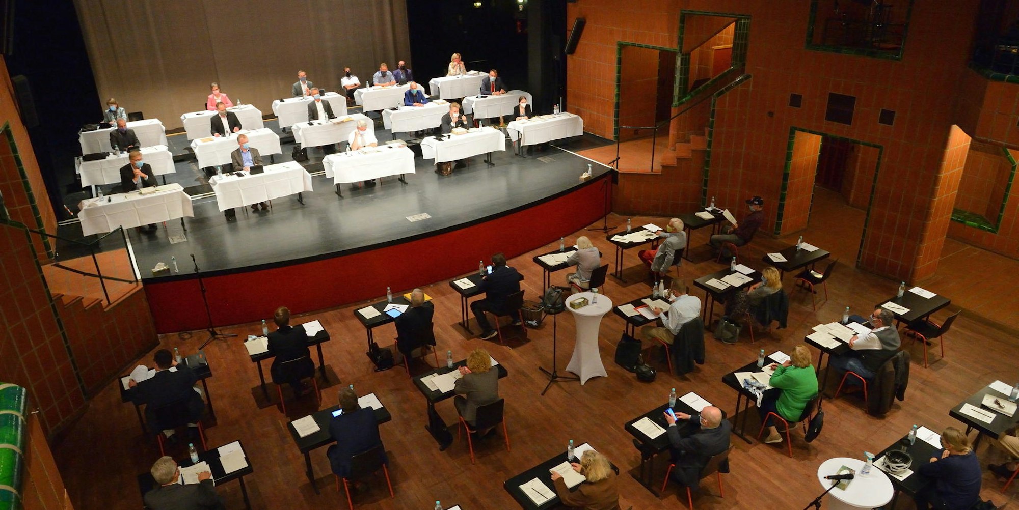 Ratssitzung in Gladbach unter Corona-Bedingungen: Die Verwaltung sitzt an an weißen Tischen auf der Bühne, die Politik im Zuschauersaal.