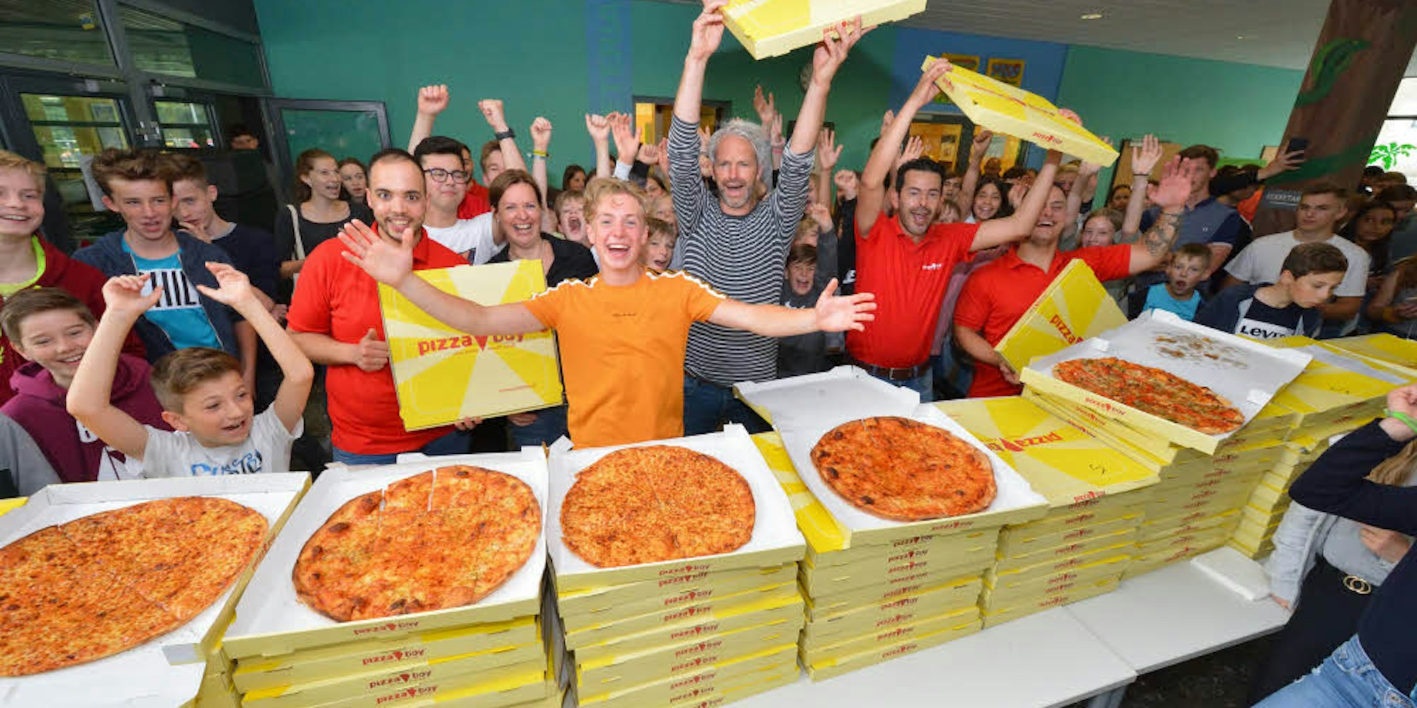 Der schwere Duft von Hefe und Tomatensoße liegt in der Luft, mit jedem Schritt näher wird er immer intensiver, es dampft aus den Kartons. Als Schulleiter Frank Becker die erste Schachtel öffnet, jubeln alle Schüler in der Eingangshalle. „Was für eine verrückte Aktion“, ruft Becker noch. Dann geht die Pizzaschlacht los.