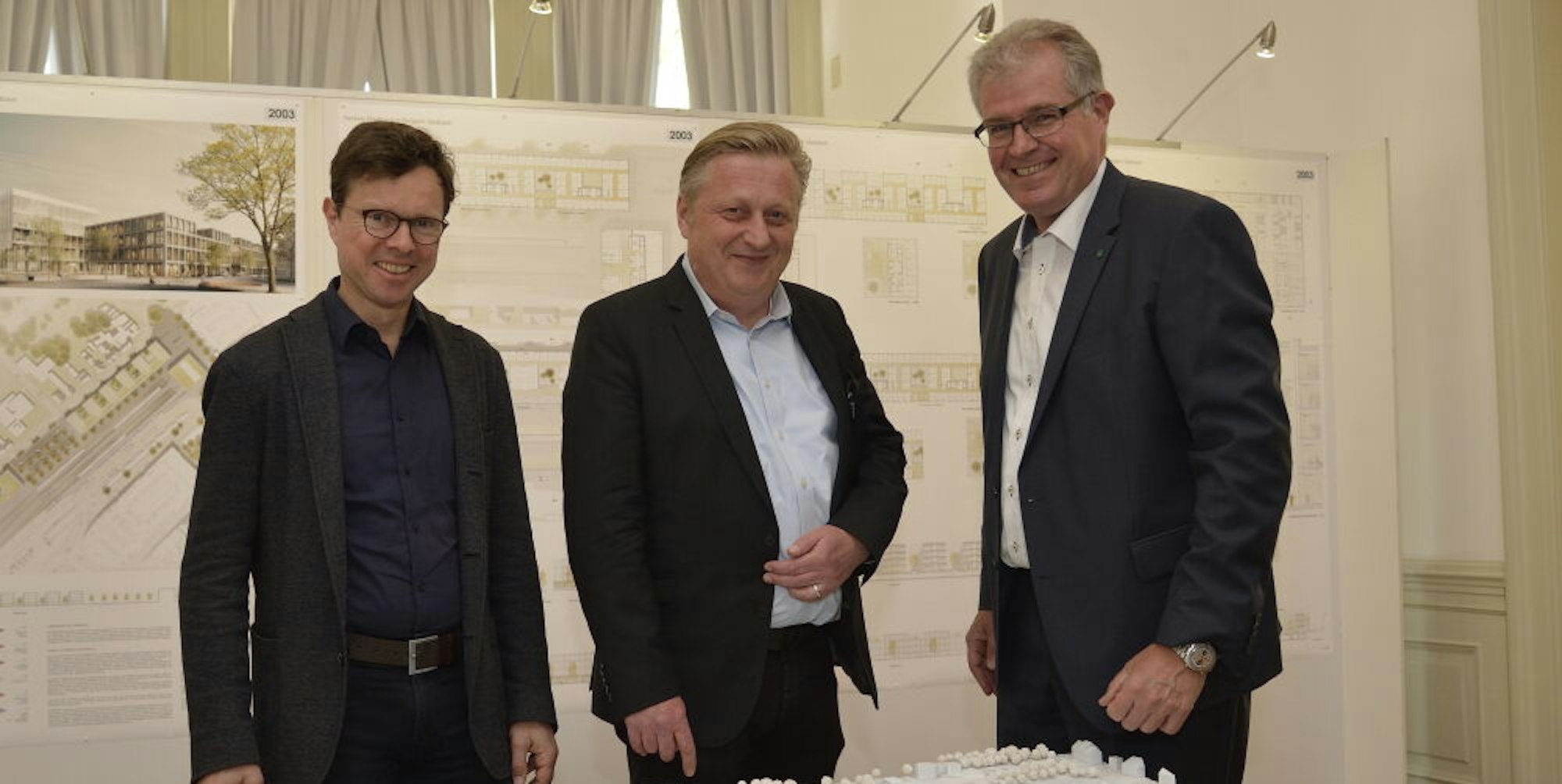 Da war die Welt noch in Ordnung: Jörn Scholz (Mitte) bei der Präsentation des Siegerentwurfs des Architekturbüros Auer Weber Assoziierte. Links von ihm Tilman Latz, rechts Frank Wilhelm.
