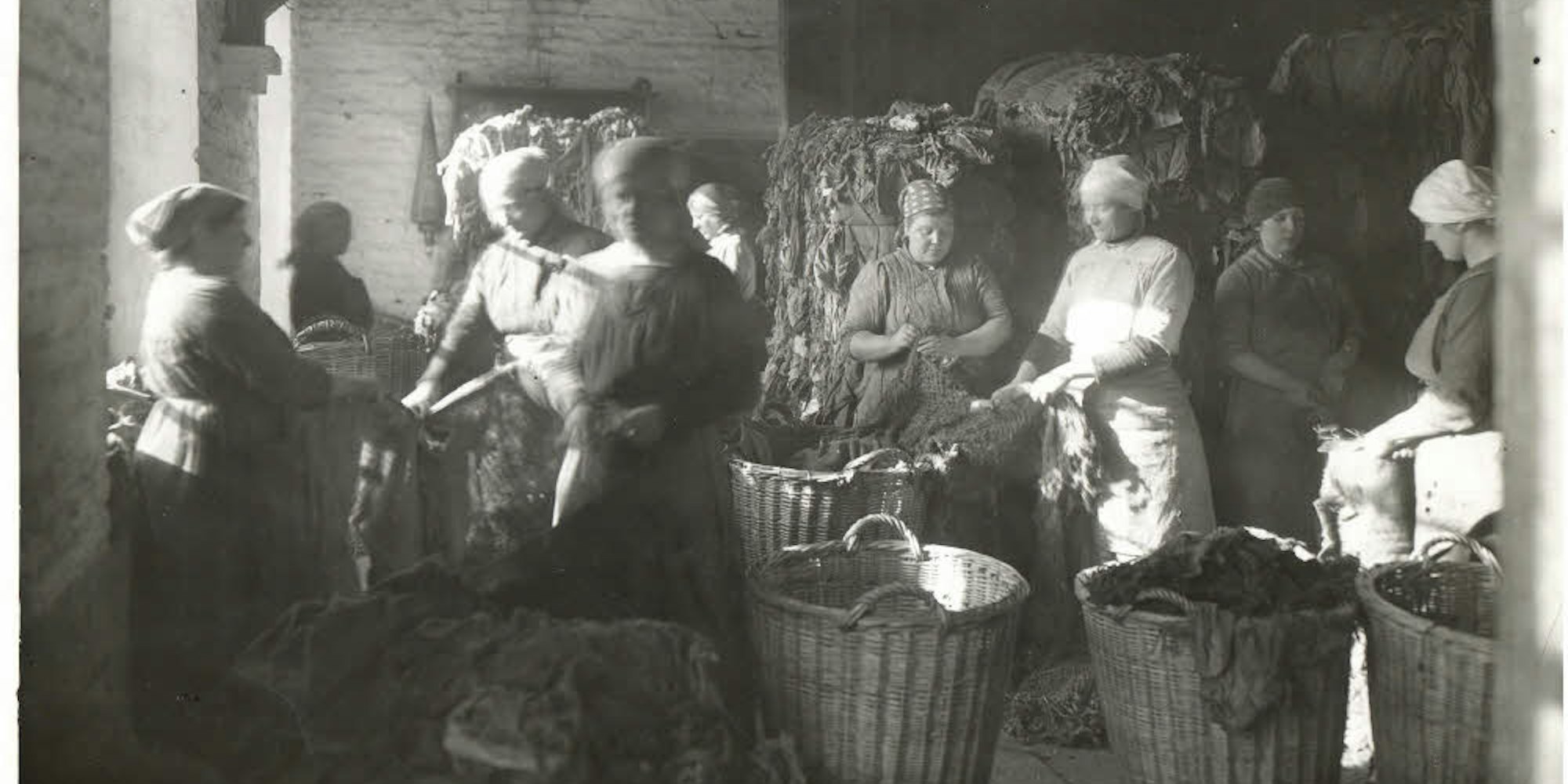 Lumpensortiererinnen bei der Arbeit. Lange Zeit waren alte Textilien der wichtigste Rohstoff für die Papierherstellung.