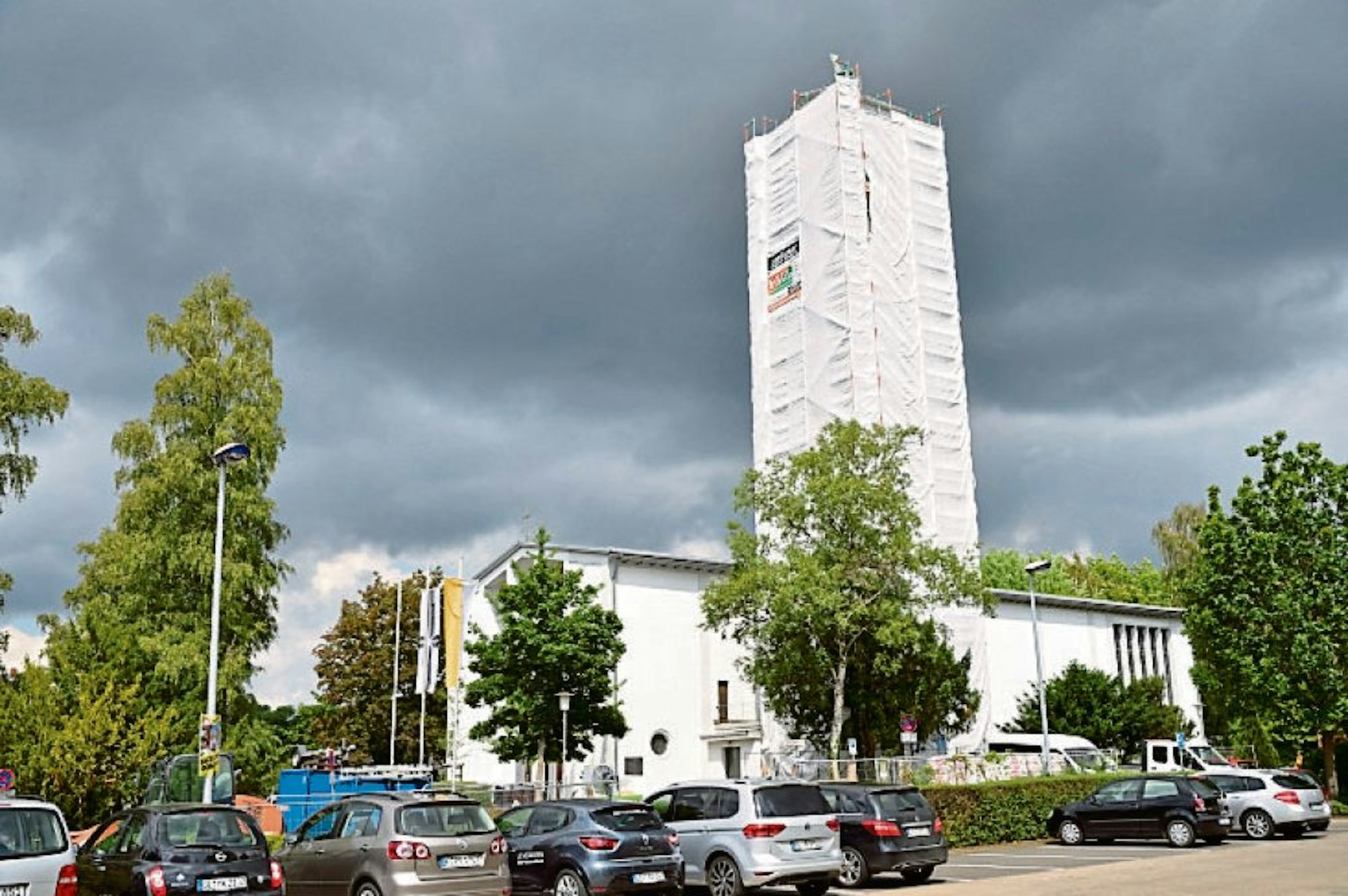 Die Pfarrkirche St. Marien mit dem Glockenturm, derzeit eingerüstet. Die Kirche entstand 1953 nach Plänen Bernhard Rotterdams.