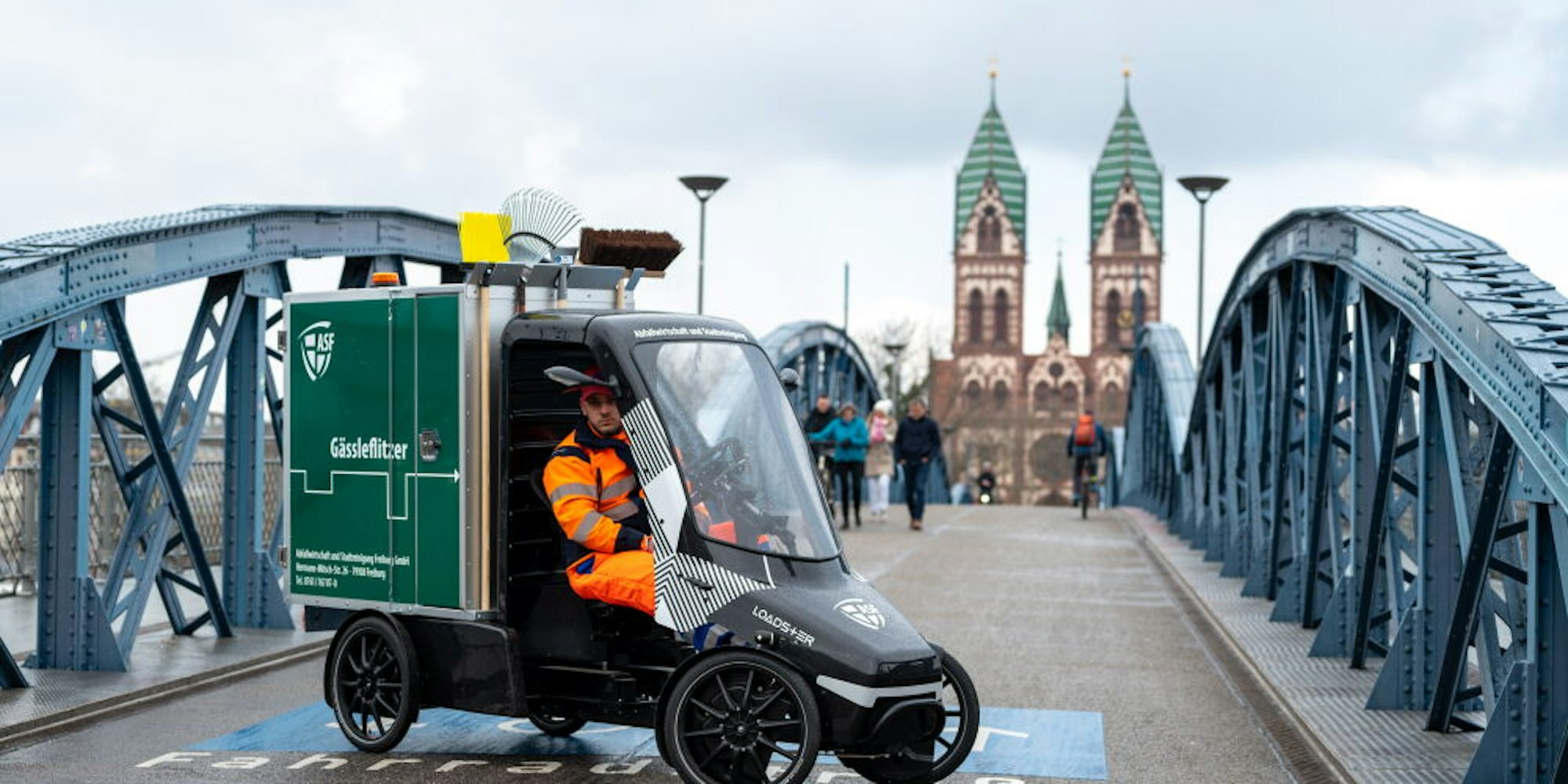 Die Mitarbeiter der Abfallwirtschaft würden sehr gerne mit den „Gässleflitzern“ arbeiten, und Freiburg denke bereits an die Anschaffung weiterer Modelle. 2,2 Tonnen CO2 sparten die sechs Fahrgeräte in jedem Jahr an. Maßgeschneidert rollen sie durch die Breisgau-City: mit Kehrbesen und Gartenrechen als Aufbauten. Hinzufügen könnte man, dass die „Gässleflitzer“ die laut Hersteller „Loadster“ heißen, auch von Unternehmen wie der Deutschen Telekom und Onlinehändler Zalando eingesetzt werden, dass die Geräte als Fahrrad gelten und förderbar sein könnte. In Münster und Berlin setzt die Telekom ihre Techniker probeweise auf Loadster.