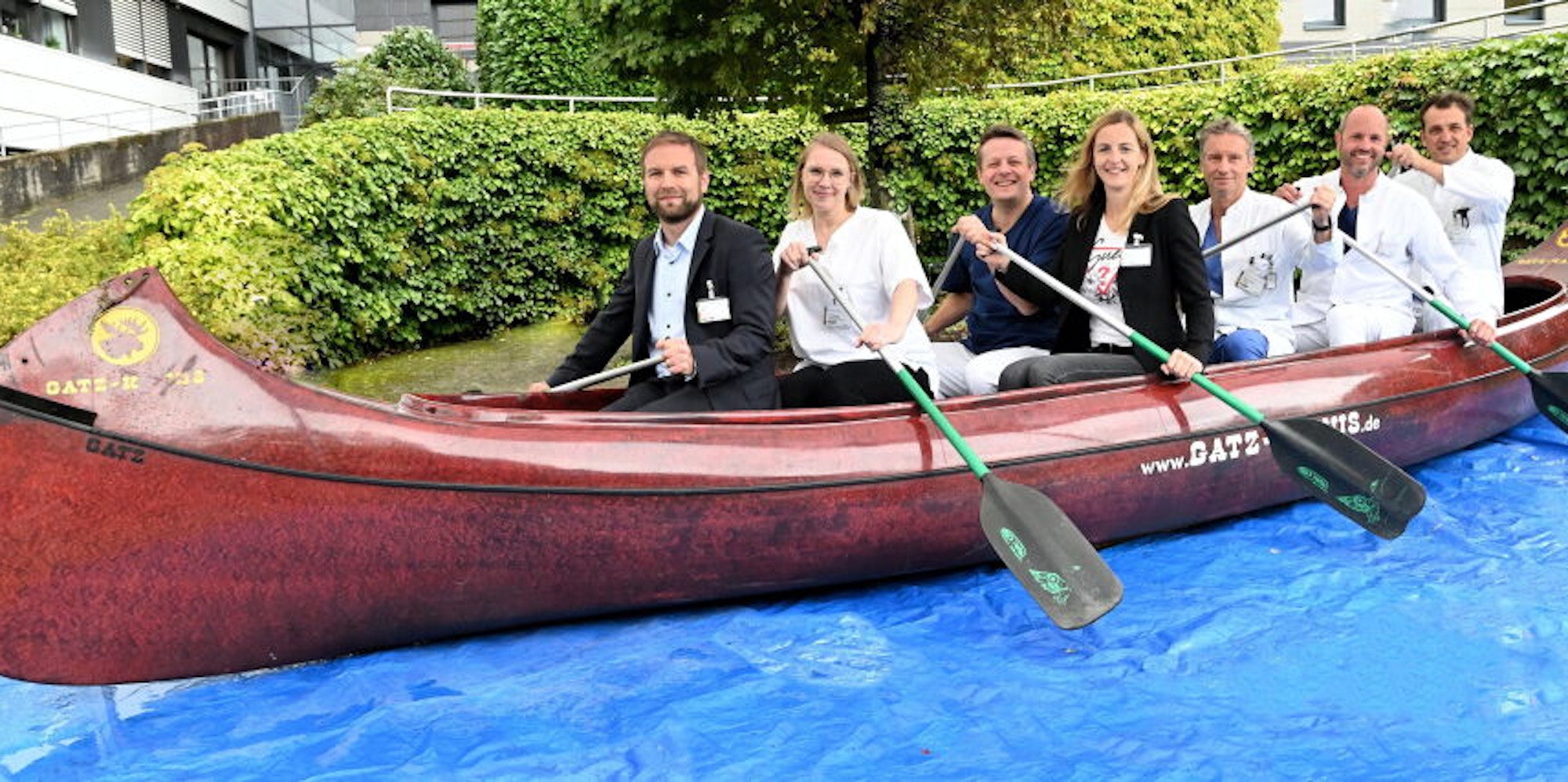 Bergisch Gladbach – Sieben in einem Boot: Für die Präsentation ihrer Kooperation haben die Verantwortlichen von Marienkrankenhaus (MKH) und Vinzenz-Pallotti-Hospital (VPH) keine Mühe gescheut und ein Kanu in den Patientengarten des MKH hochgeschafft. Auf stürmischer „See“, bei Regen und Wind, herrscht dennoch Optimismus, auf dem richtigen Kurs zu sein. Ab 1. Oktober nimmt die Kooperation zwischen den beiden GFO-Kliniken weiter Fahrt auf.