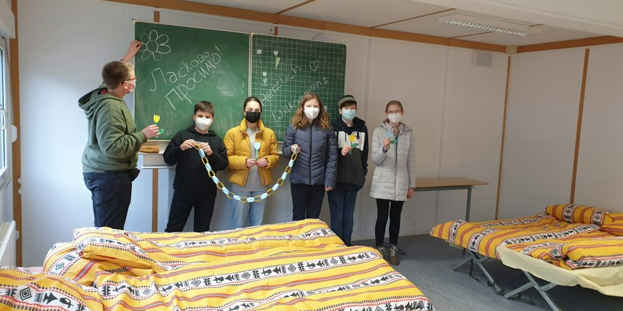 Sich selbst zurücknehmen und das teilen, was einem wichtig ist. Feldbetten und Schränke stehen schon in den Ex-Klassenzimmern. Die selbst gebastelten Dekorationen der Schüler in blau-gelb – die ukrainischen Farben, die inzwischen schon jeder auf der Welt kennt – lassen die kahlen Räume weniger trostlos wirken.