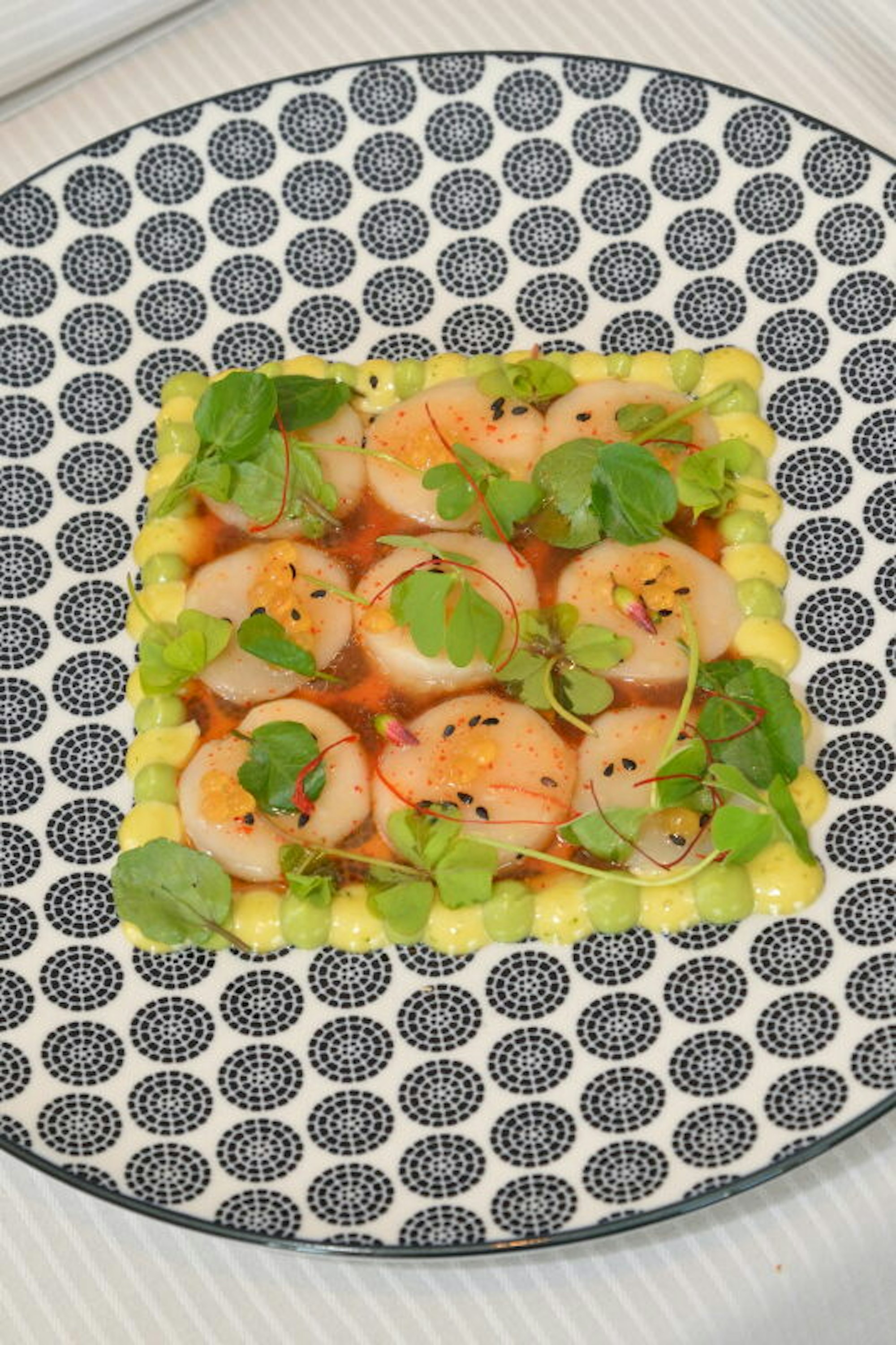 Jakobsmuschel-Sashimi mit Avocado, Sauerklee und Kresse akkurat im Karree angerichtet.