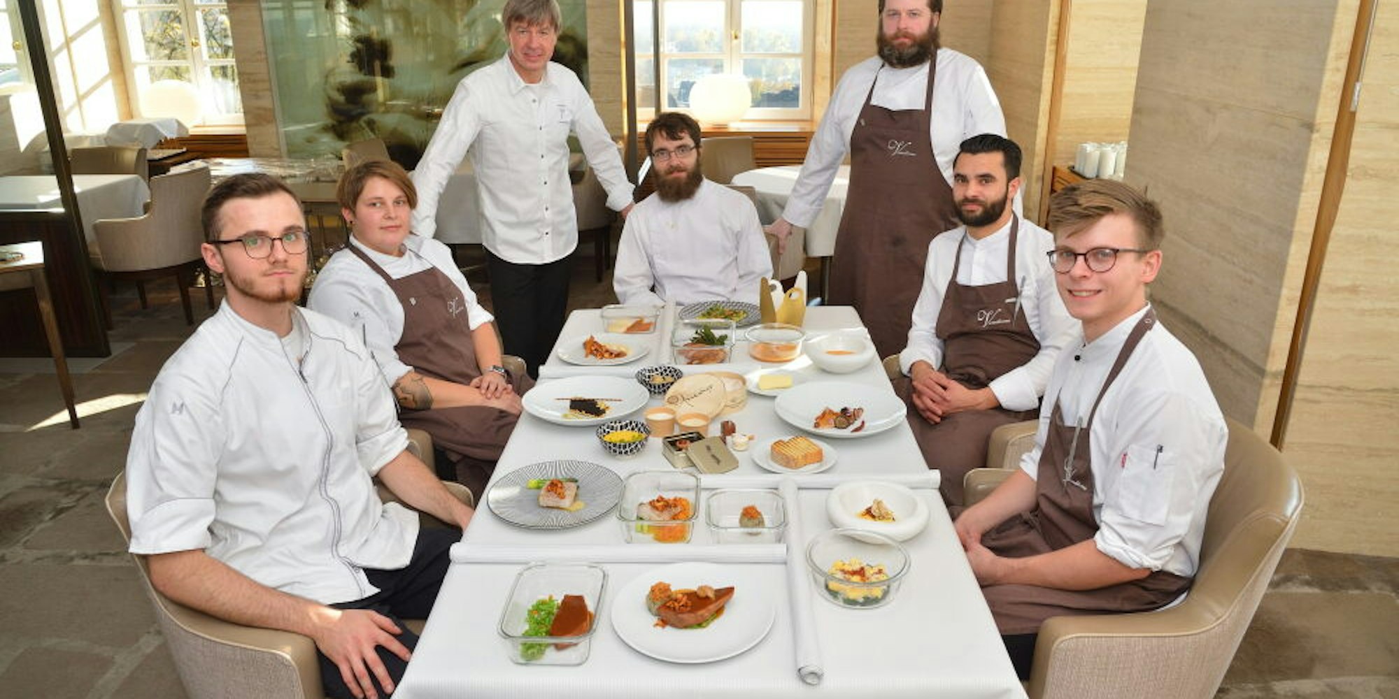 So stellt sich das Vendôme-Küchenteam die edle Familientafel zu Hause vor: v. l. ringsum Vinzenz Erras, Hella Eggers, Küchenchef Joachim Wissler, Pierre Marie Varrel, Souschef Denis Jahn, Dennis Melzer und Felix Grötsch.