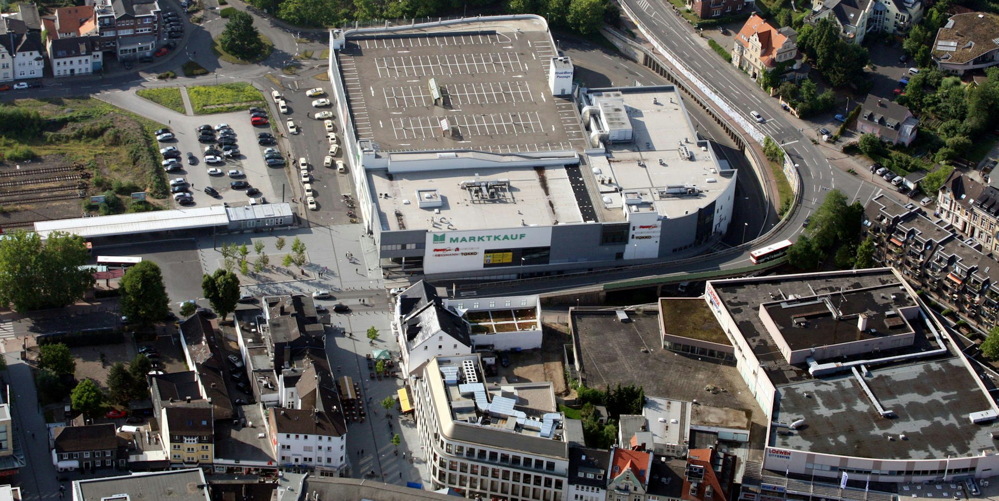 Die Rhein-Berg-Passage wurde im September 2007 neu eröffnet, auf dem Gelände des ehemaligen Busbahnhofs mit Parkhaus. Ankermieter war der zur Edeka-Gruppe zählende „Marktkauf“. Noch im März berichtet Johannes Nendel, Geschäftsführer des Projektentwicklers Kintyre, von Kontakten zu Edeka.