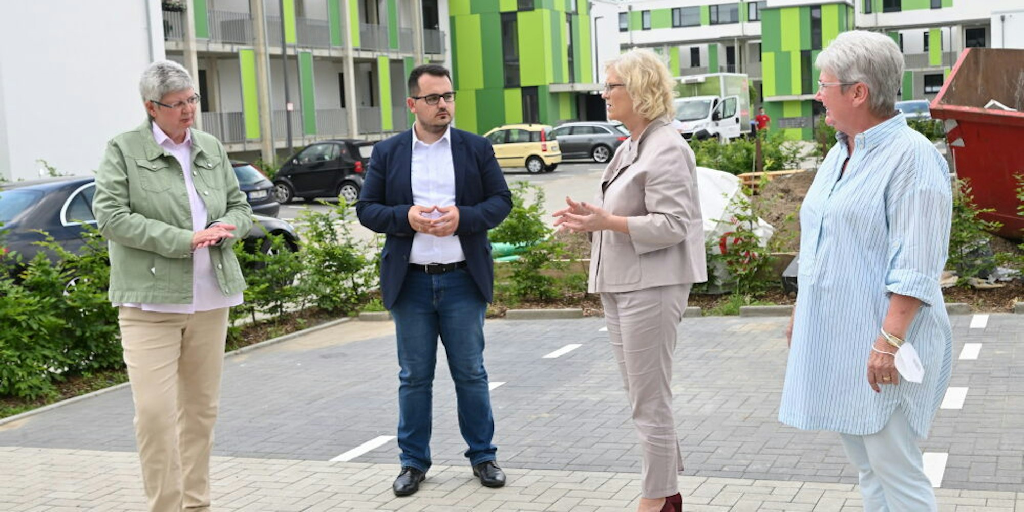 In das Quartier ziehen Menschen jeden Alters, auch eine Wohngruppe ist geplant. Während die RBS die wachsende Nachfrage nach bezahlbarem Wohnraum – 9,50 Euro pro Quadratmeter beträgt die Nettokaltmiete in Hand – betont, sagt die Ministerin: „Wir müssen bauen, den Menschen ein Zuhause schaffen.“ Politisches Ziel sei es auch in den sozialen Wohnungsbau zu investieren. Neben den 67 bis 102 Quadratmeter großen Wohnungen entsteht zurzeit ein Kinderspielplatz. Ferner gibt es verteilt an den Häusern rund 250 Fahrradstellplätze.