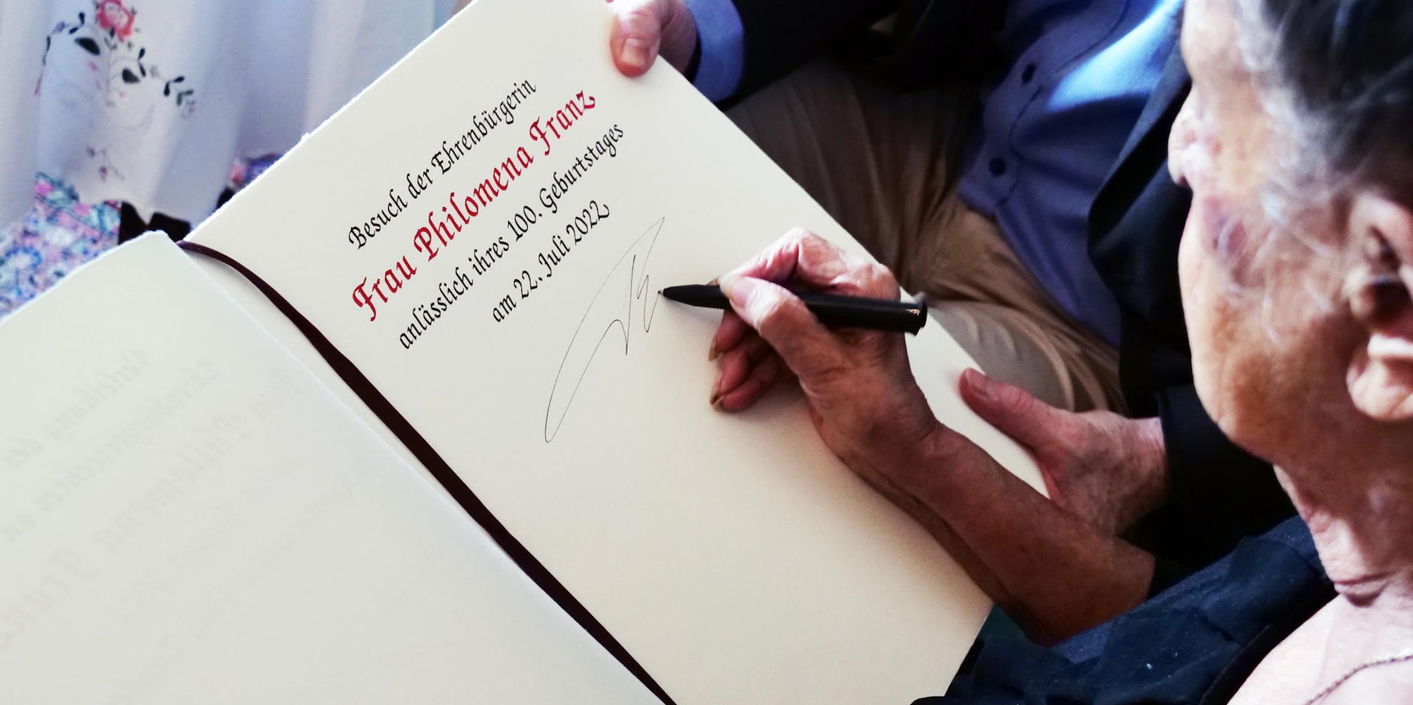 Bergisch Gladbach – Wie die Gladbacher Stadtverwaltung mitteilt, hat sich Philomena Franz an ihrem 100. Geburtstag in das Goldene Buch der Stadt eingetragen. Die Gladbacher Ehrenbürgerin feierte ihren Geburtstag in Rösrath, wo eine Tagung und ein Konzert an dem Geburtstag stattfand.
