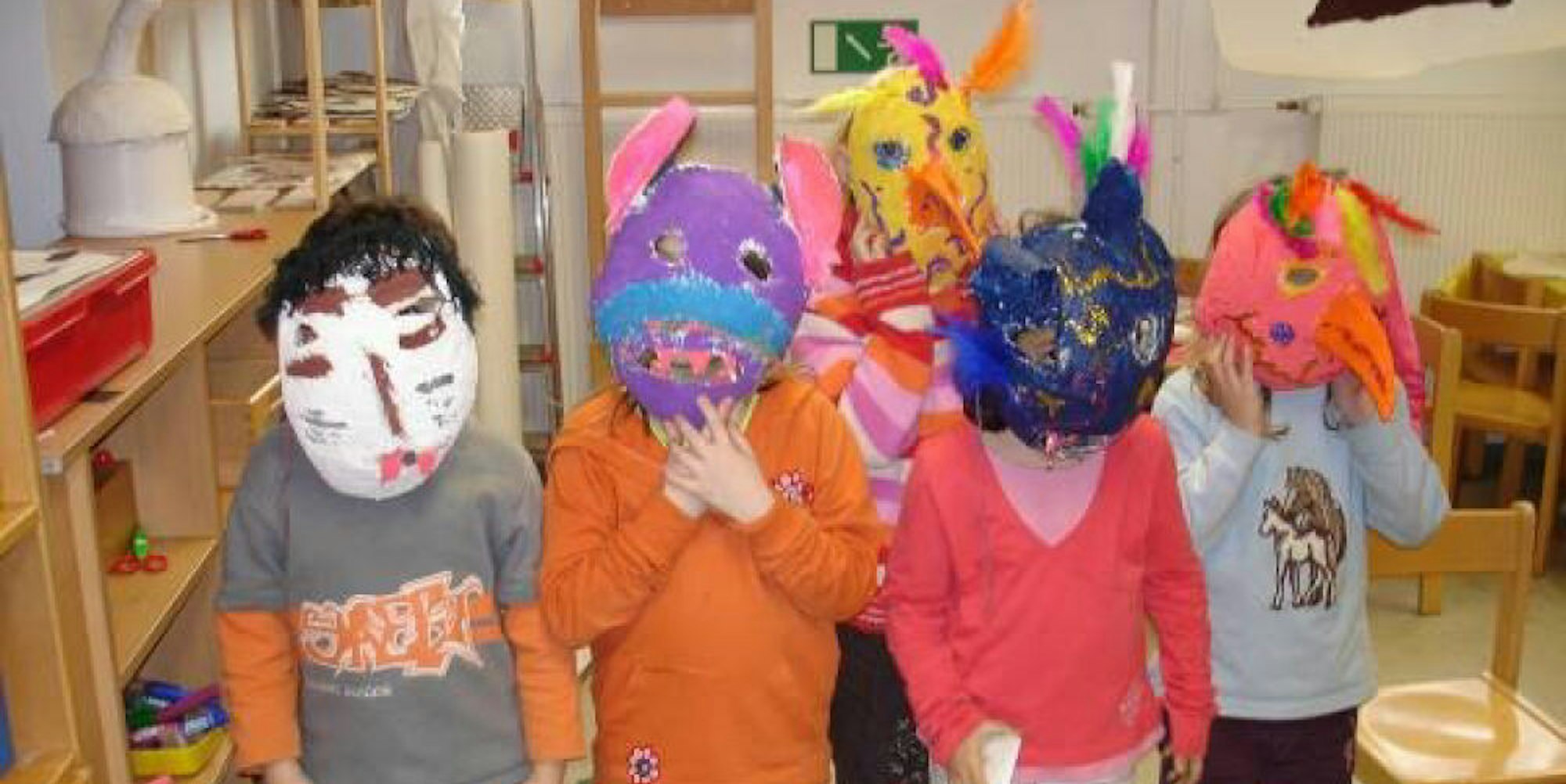 Sieht ein bisschen nach Karneval aus: Selbst gebastelte Masken im Schulkinderhaus.