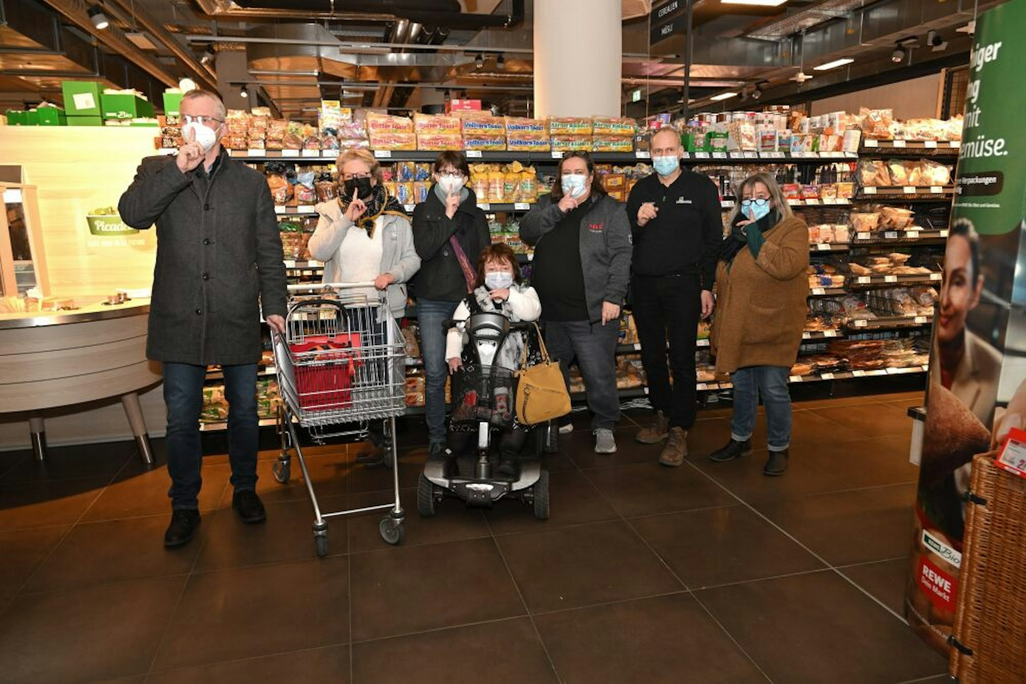 „Stilles Einkaufen“: (v.l.) Bürgermeister Frank Stein, Anne Skribbe, Katharina Kaul (beide Beirat), Monika Hiller (Inklusion), Ursula Wintgens, Markus Hetzenegger und Angela Mascharz (Beirat) vorbei.