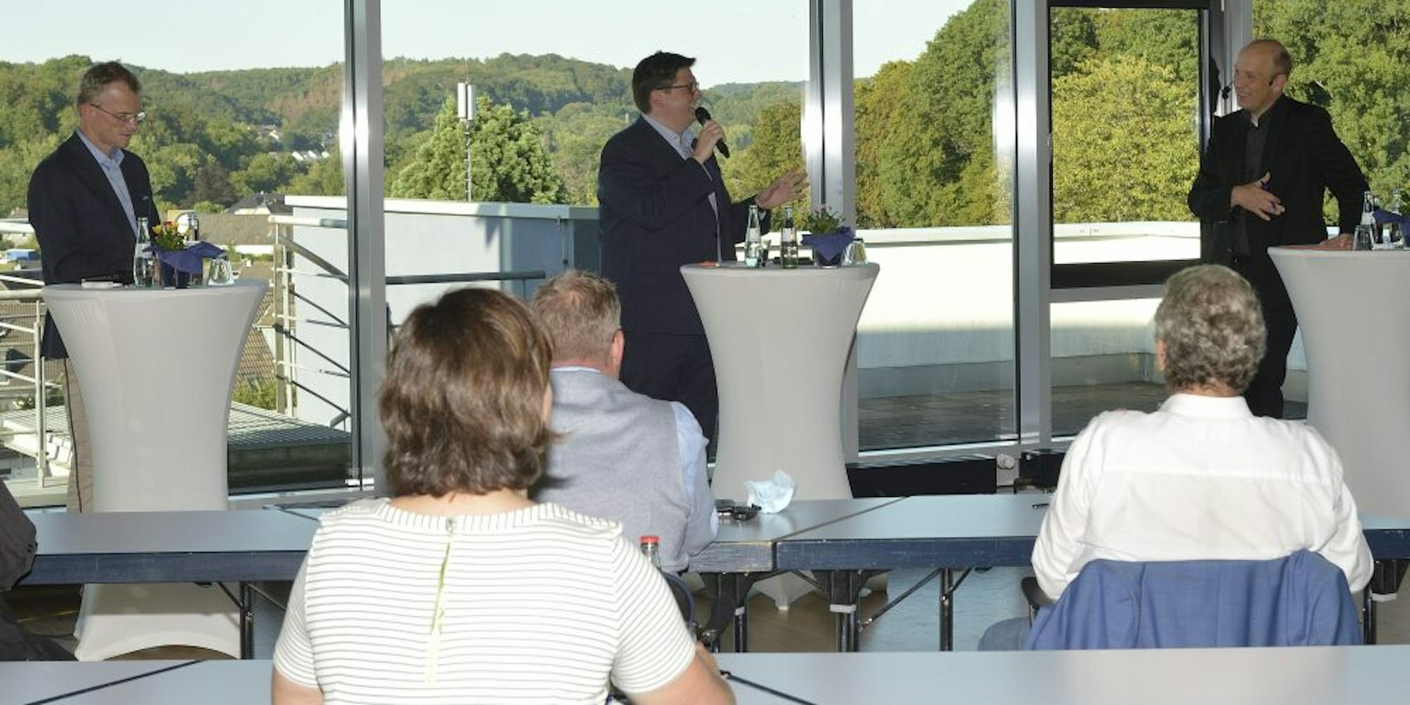 Vor Wirtschaftsvertretern diskutierten (v.l.) Frank Stein und Christian Buchen, moderiert von Guido Wagner (r.).