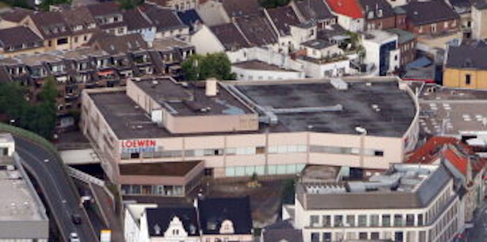 Architektonisch nicht gerade eine Augenweide: Das Loewen-Citycenter (hinten in der Mitte) in Gladbachs Innenstadt zwischen Hauptstraße (r.) und Rampe der Stationsstraße (l.).