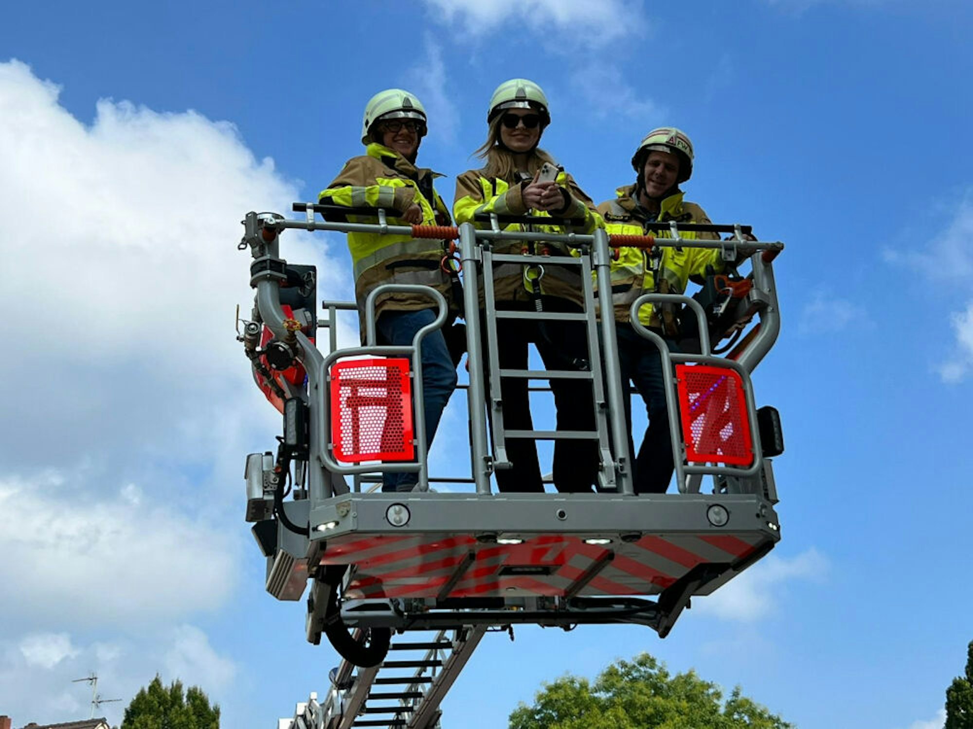 Feuerwehrchef Jörg Köhler (r.) mit den Vertreterinnen aus Butscha im Korb einer Feuerwehr-Drehleiter hoch über Bergisch Gladbach.